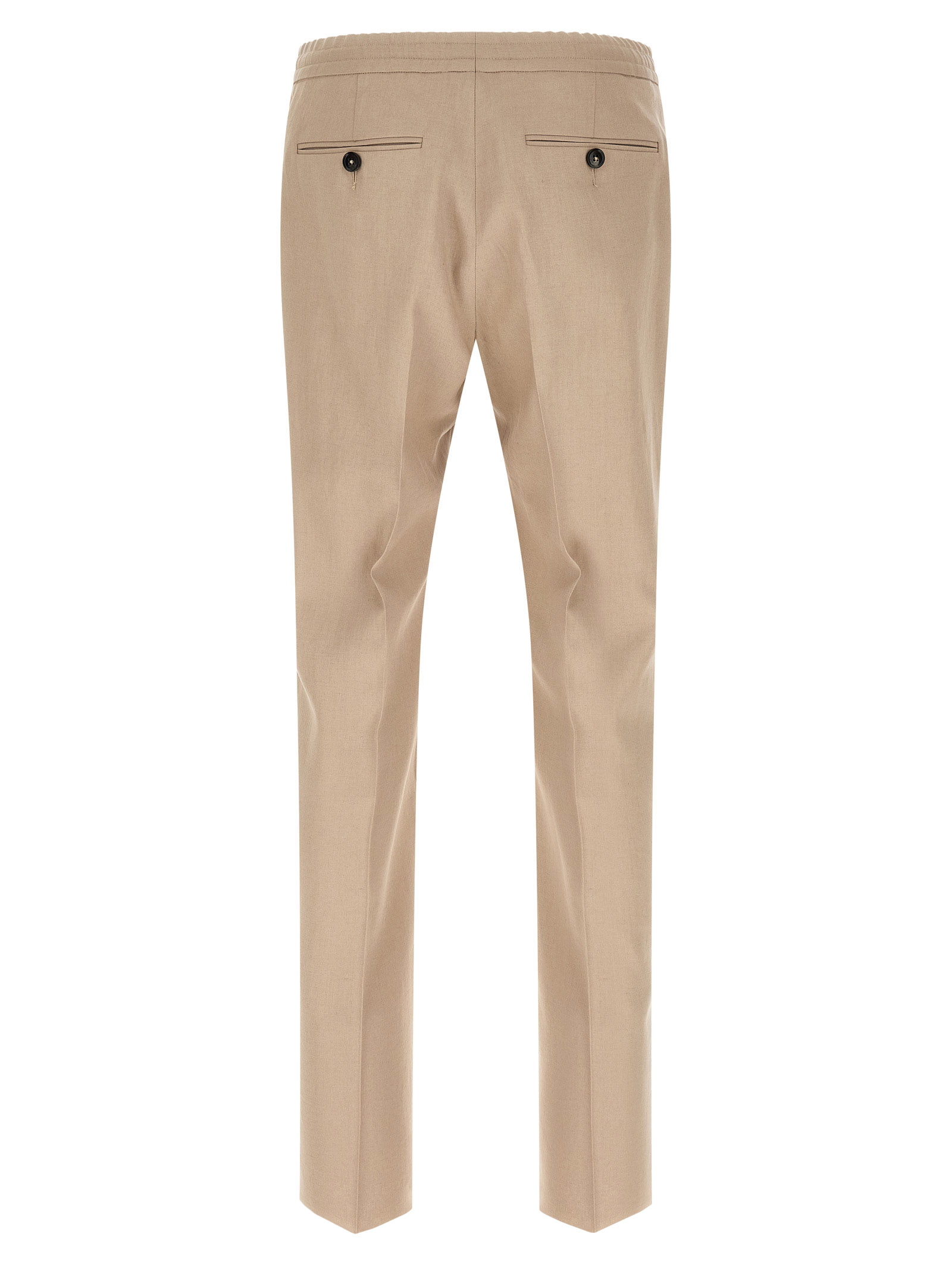 Linen trousers, formal design, zip and button closure, elastic waistband, adjustable drawstring, side pockets, straight leg with front stretched pleat, back welt pockets with button.
