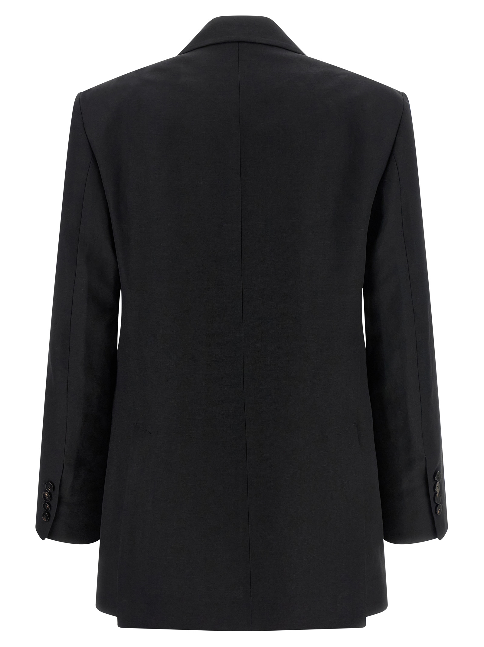 Double-breasted blazer in viscose and linen blend with front horn button closure, peak lapels, breast pocket, flap pockets, structured shoulder strap, long sleeves, back vents, unlined.