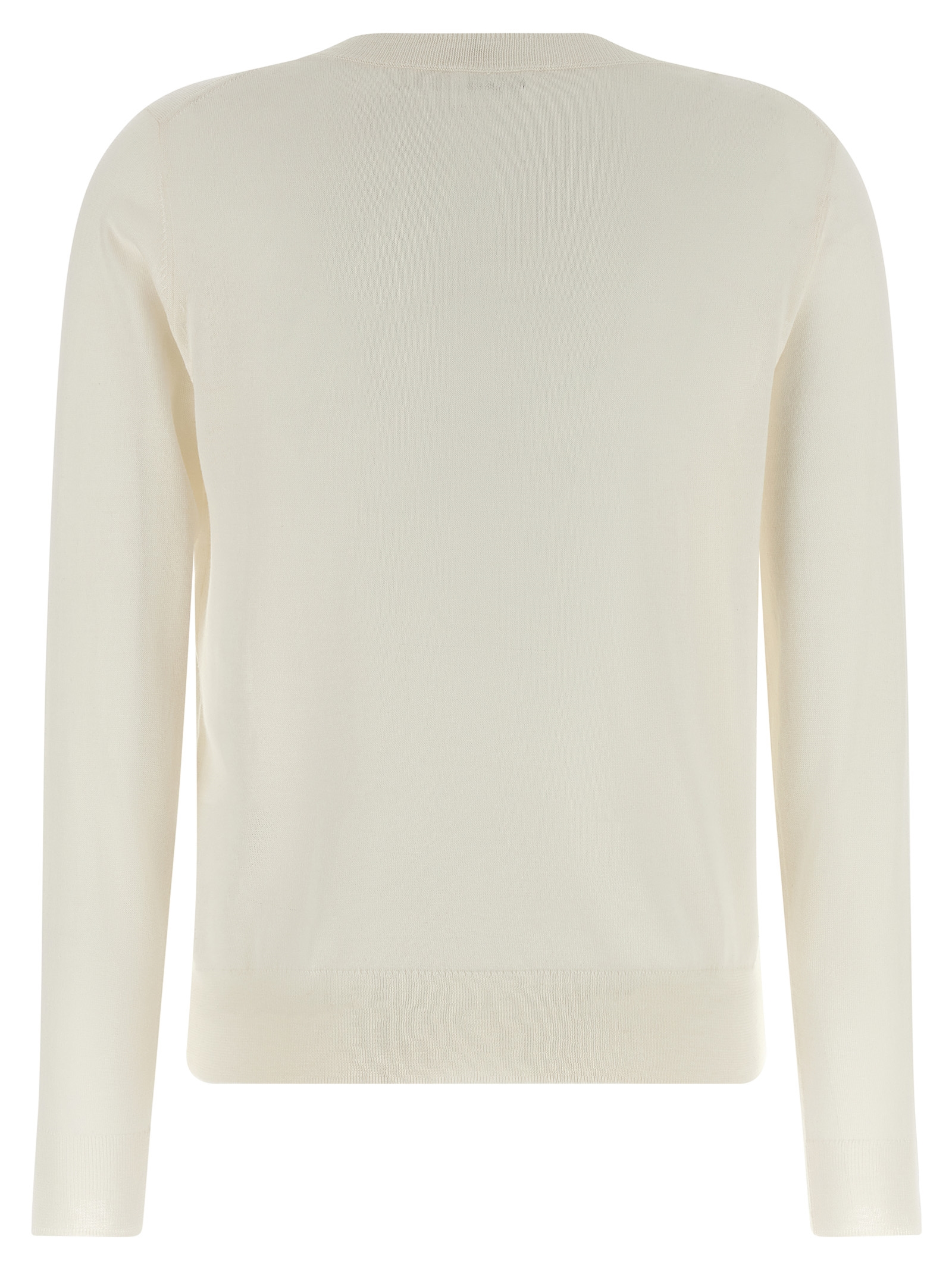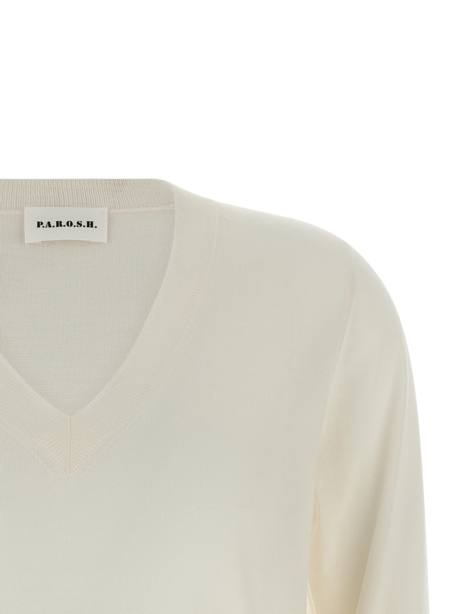 ‘Linfa26’ sweater in wool, silk and light cashmere blend, V-neck, long cuffed sleeves, and band on the hem.