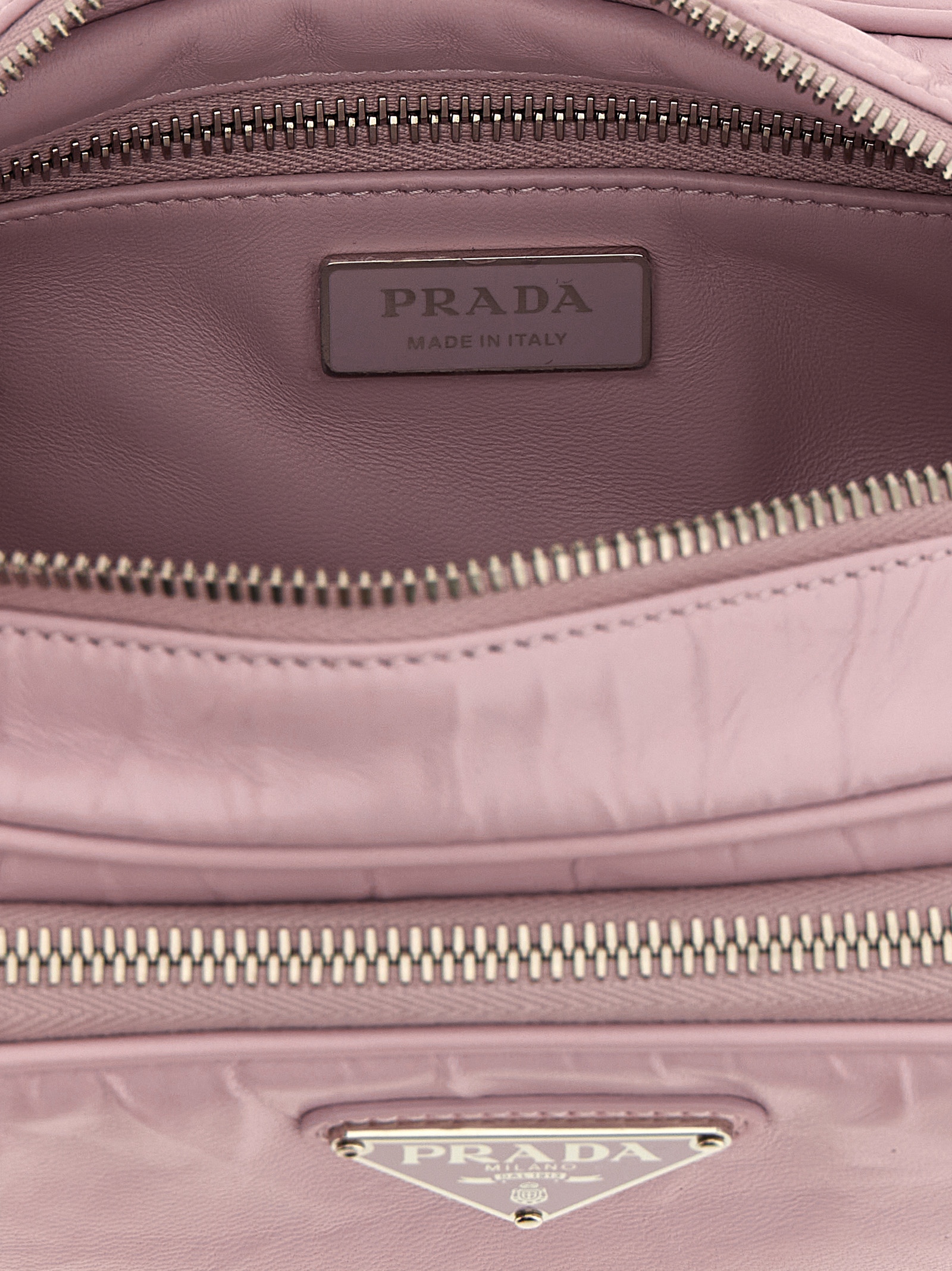 Antique nappa leather crossbody bag with triangle metal enameled logo application, a zip closure, outer zip pocket, an adjustable and removable shoulder strap and a leather logo tag.