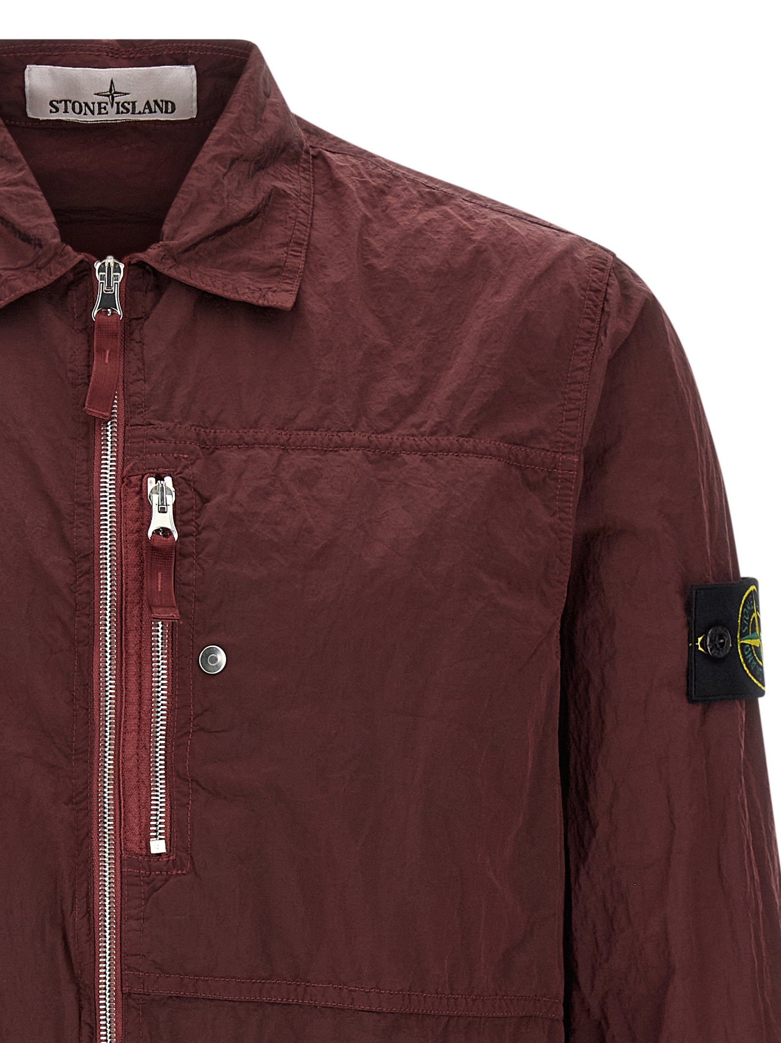 Wrinkled nylon overshirt, collar, front zip closure, pockets, long sleeves with cuffs and logo badge.