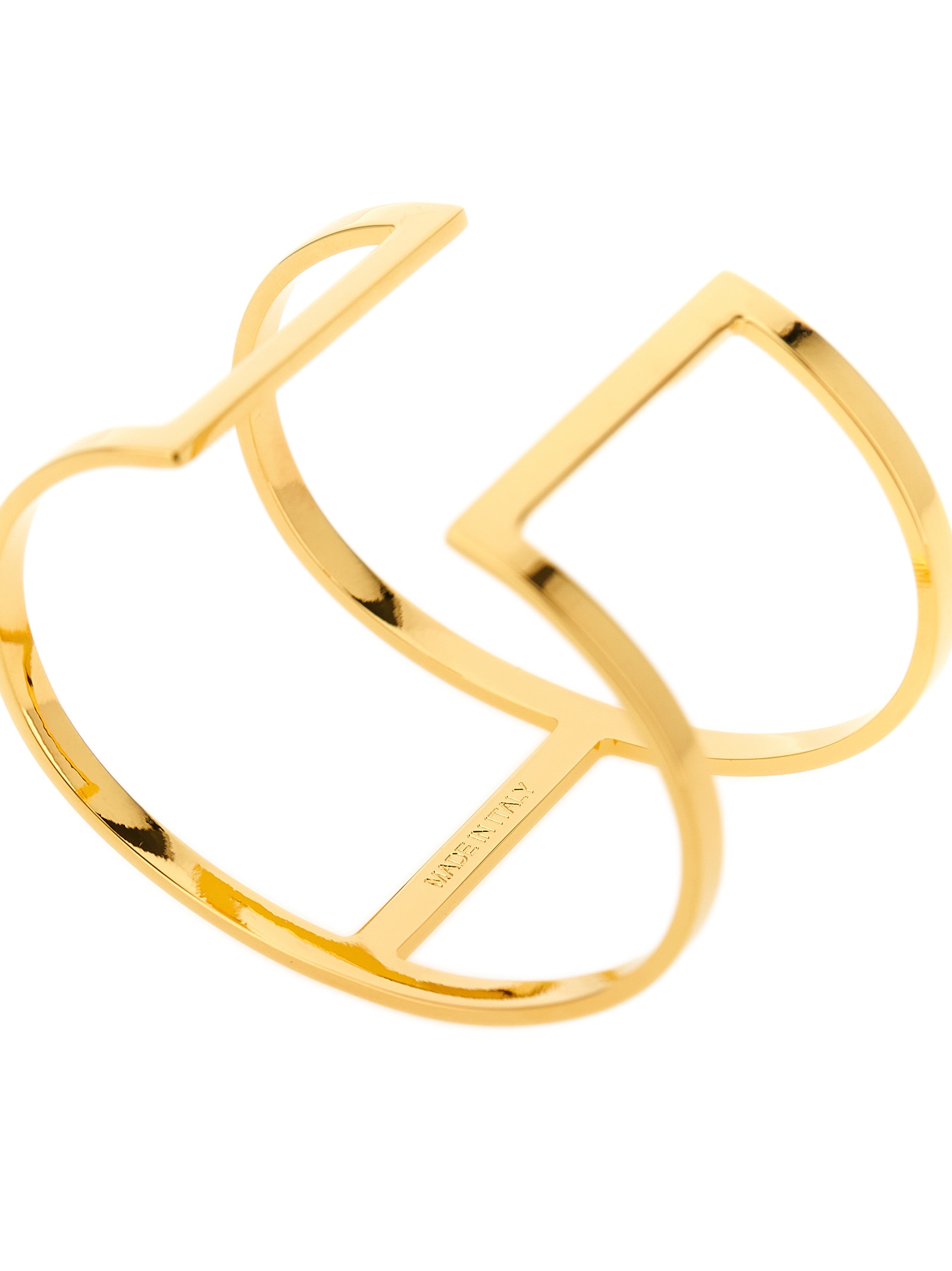 Set of two gold-finish metal bracelets, rigid logo design.