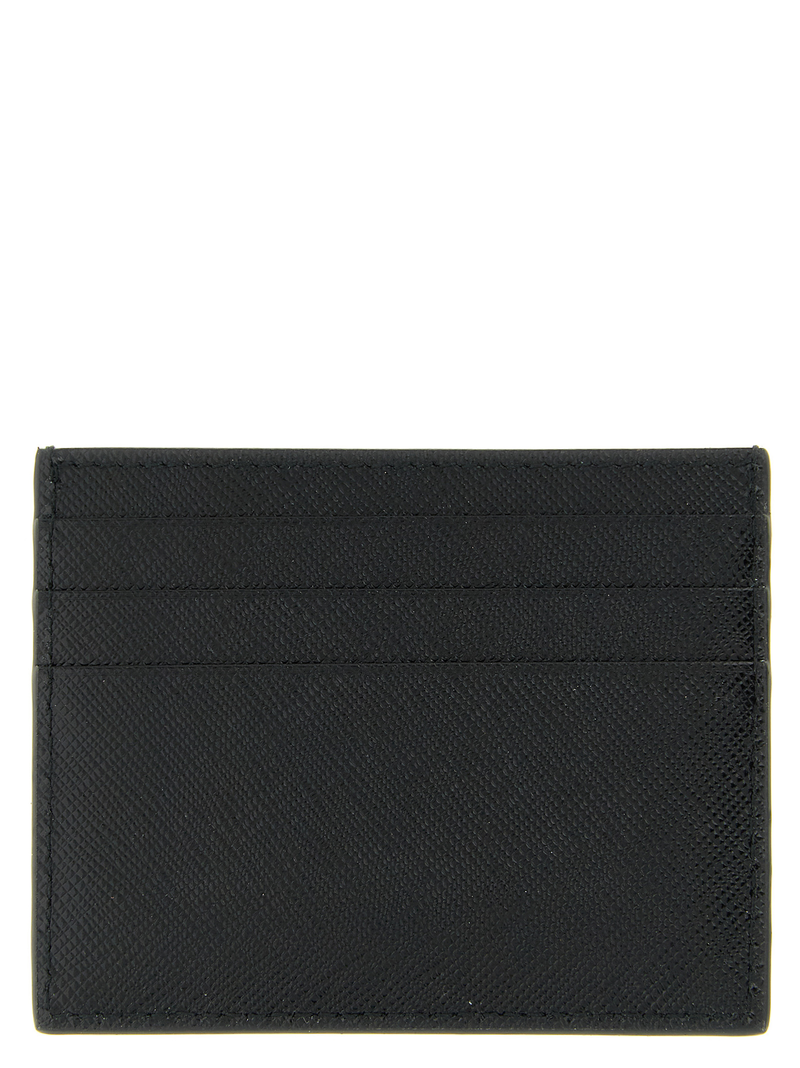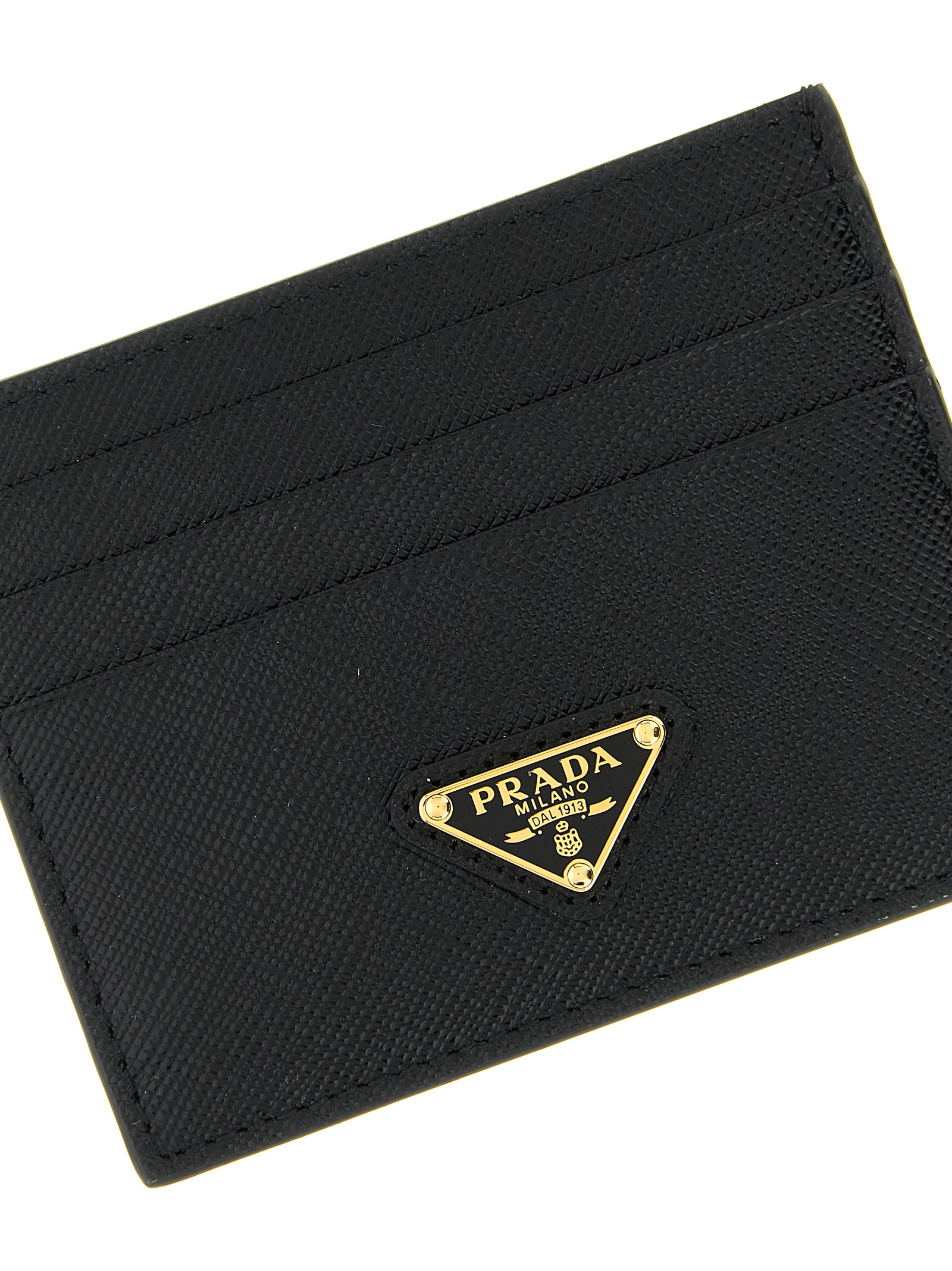 Saffiano leather card holder with metal triangle logo, gold hardware.