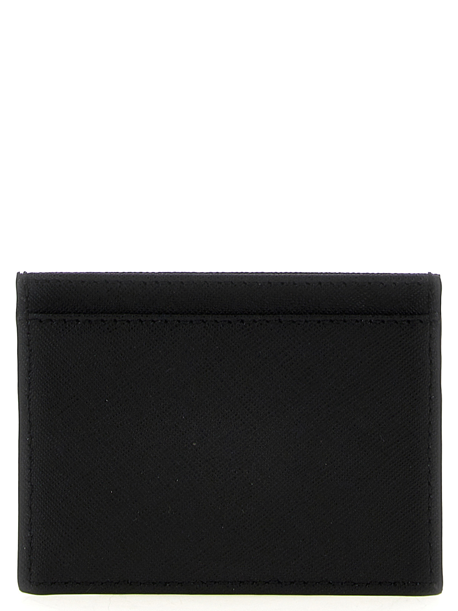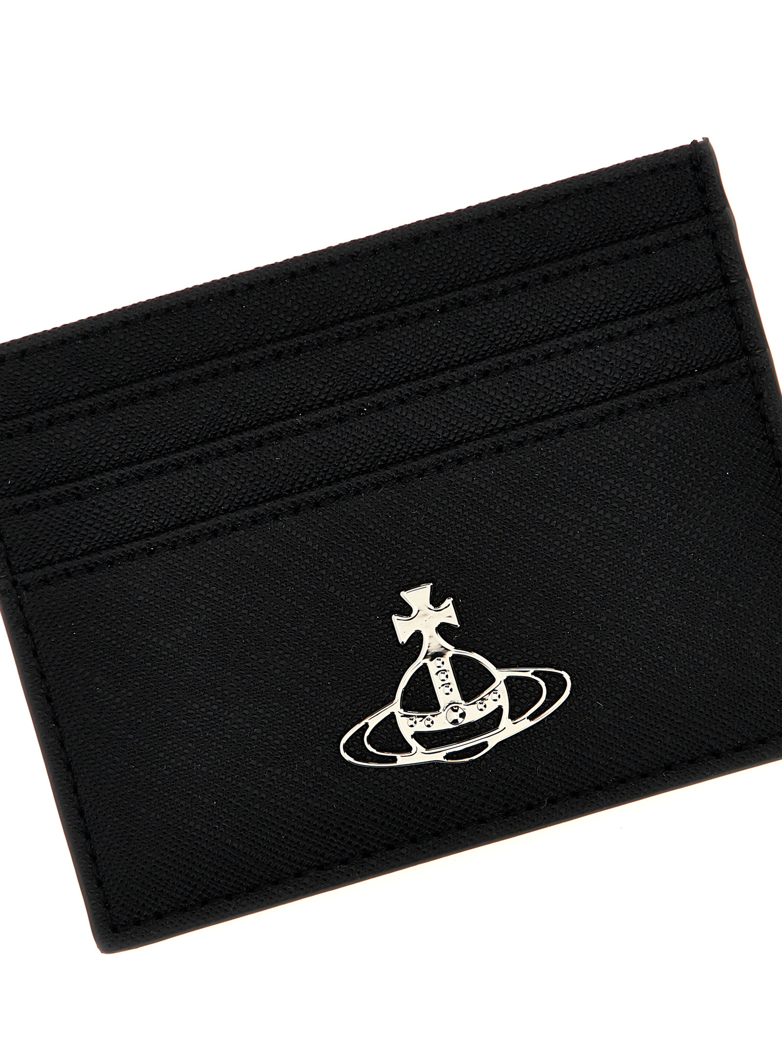 Leather card holder with metal logo detail.