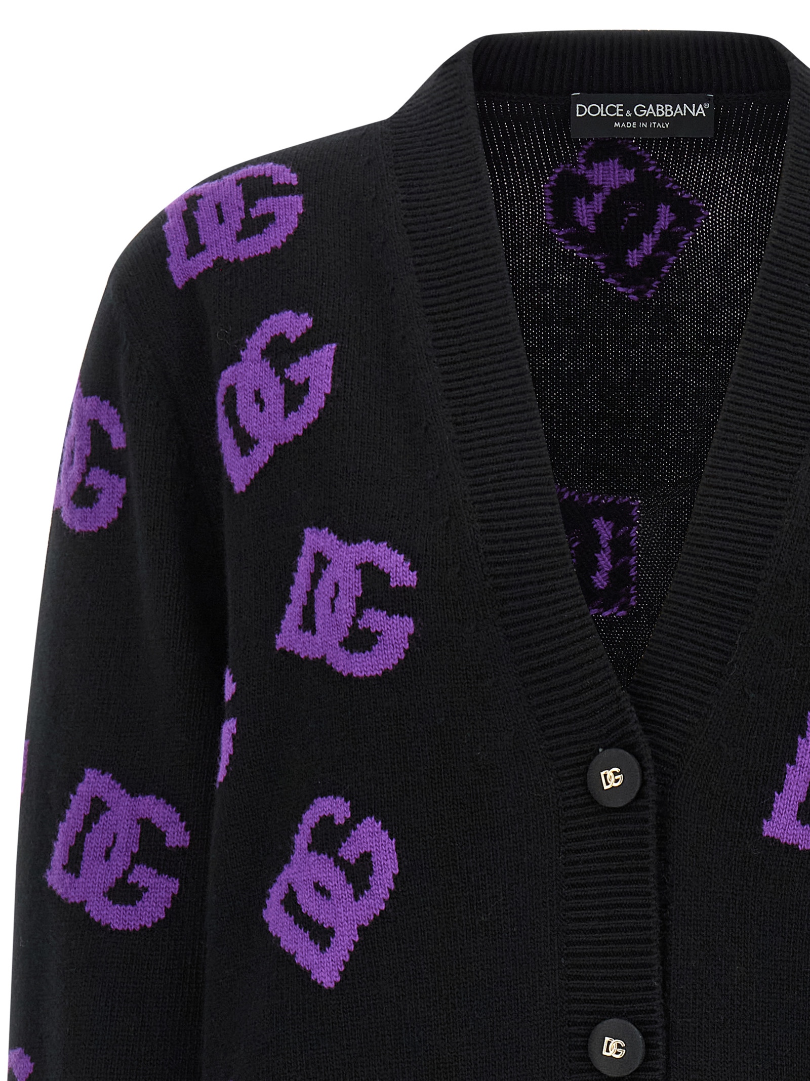Wool cardigan, V-neck with front button closure, pockets, loose fit, all-over logo intarsia, long sleeves with cuffs.