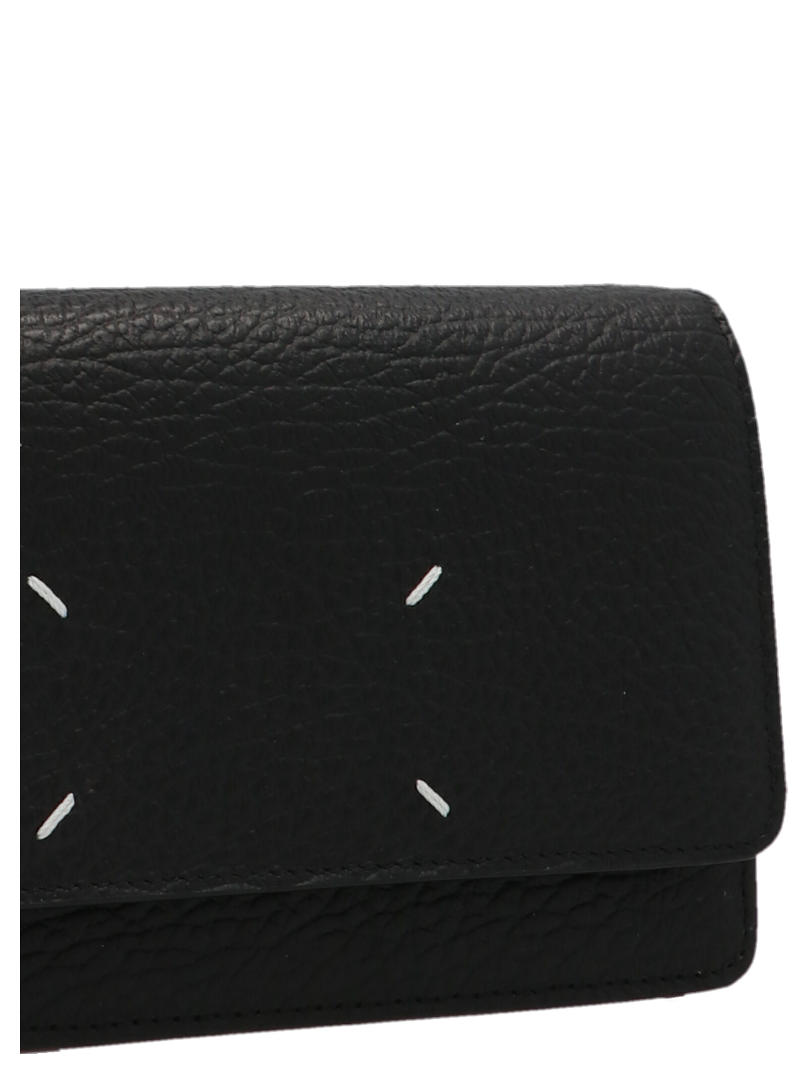 Leather chain wallet featuring stitching logo and a shoulder strap.