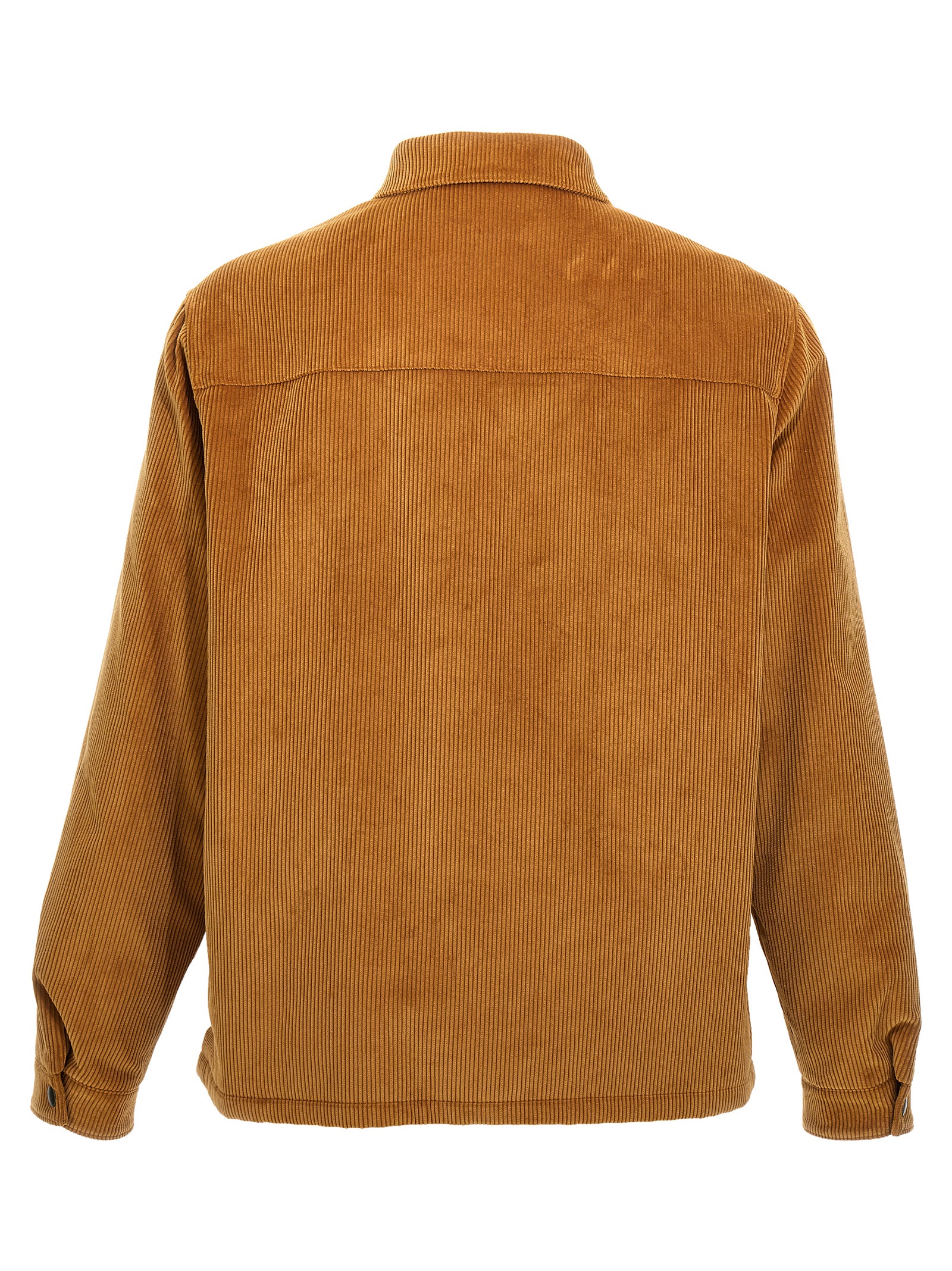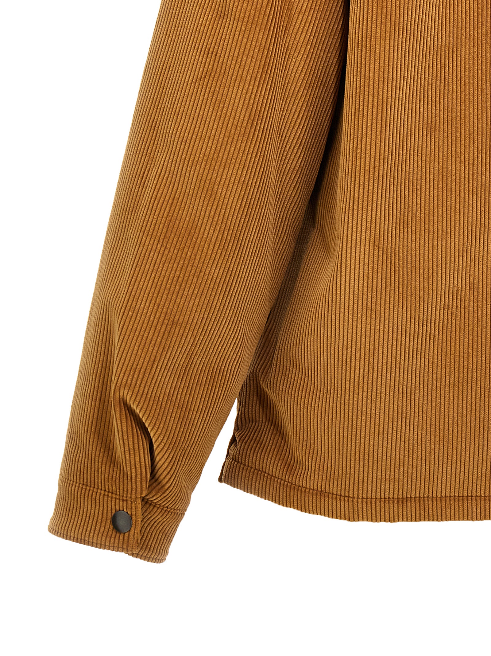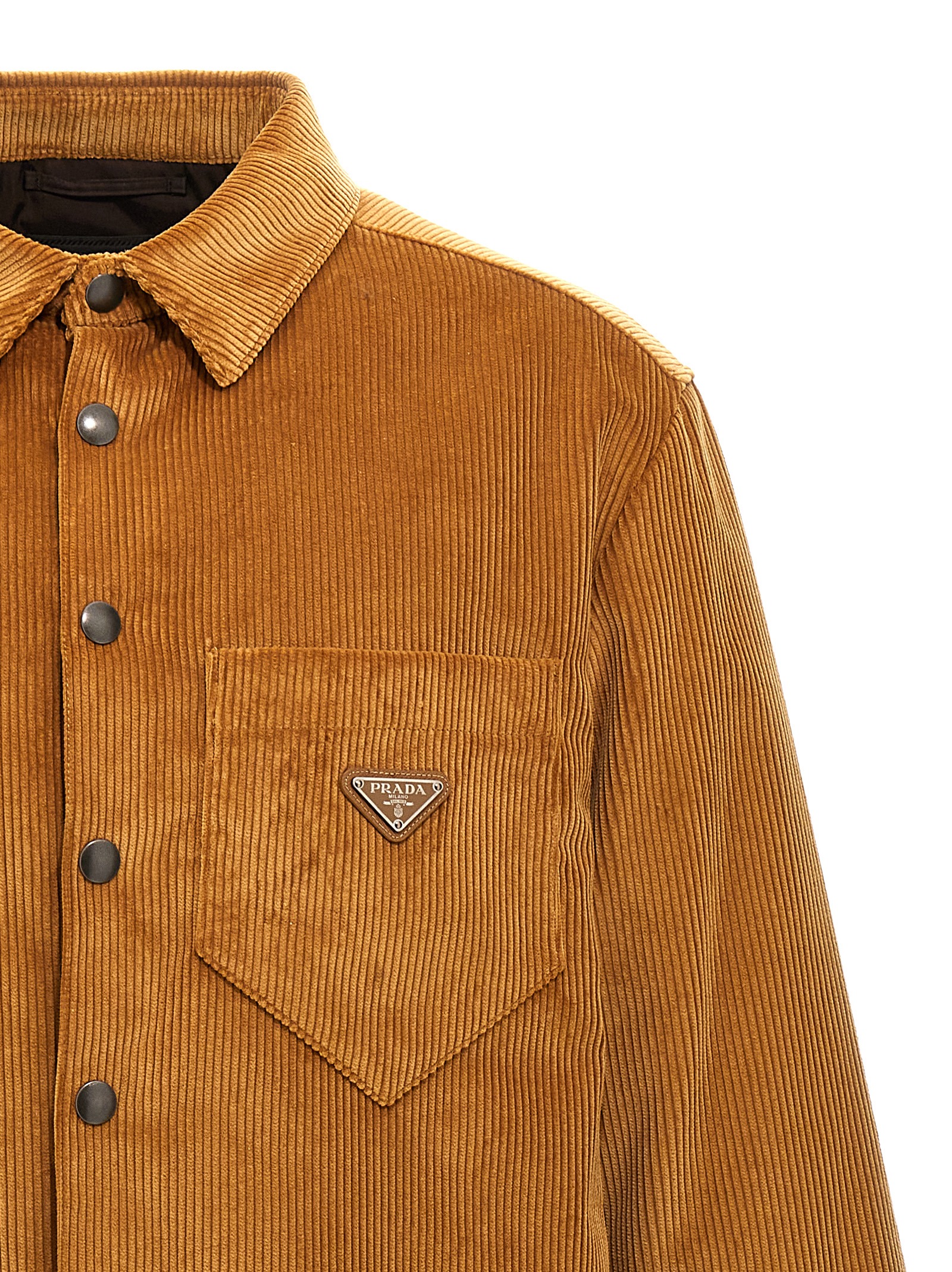 Corduroy jacket, lined, triangle enameled metal logo appliqué on the front, button closure, pockets, long cuffed sleeves.