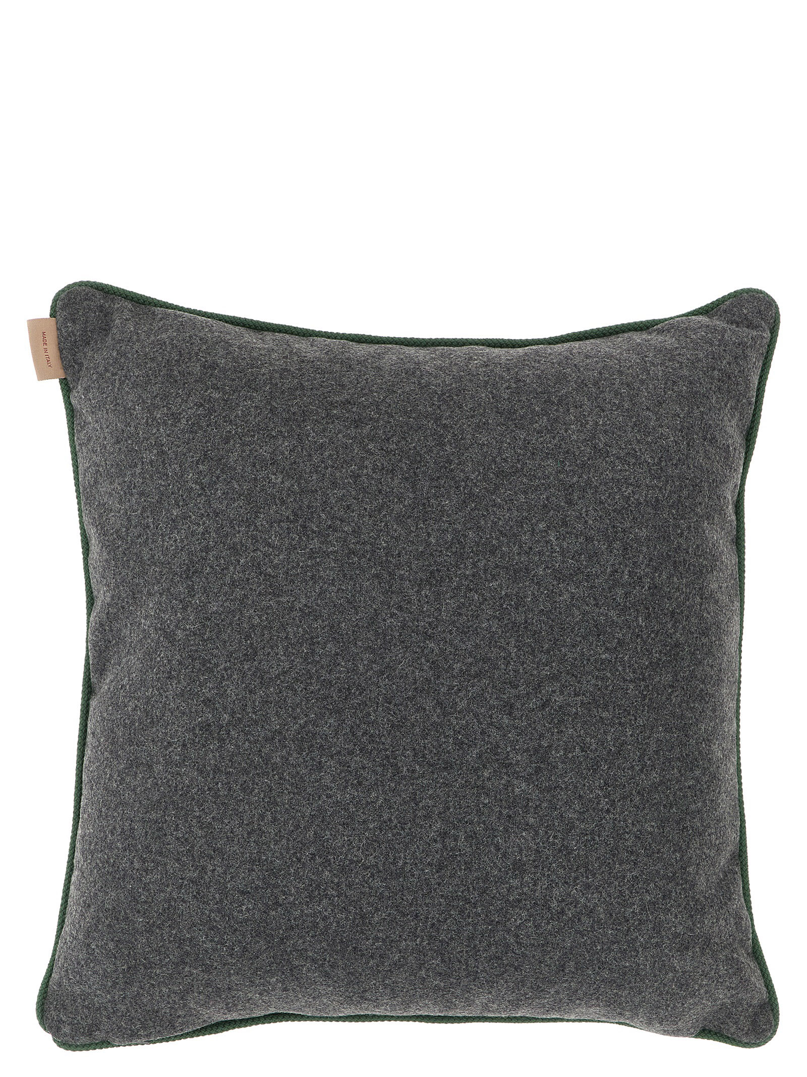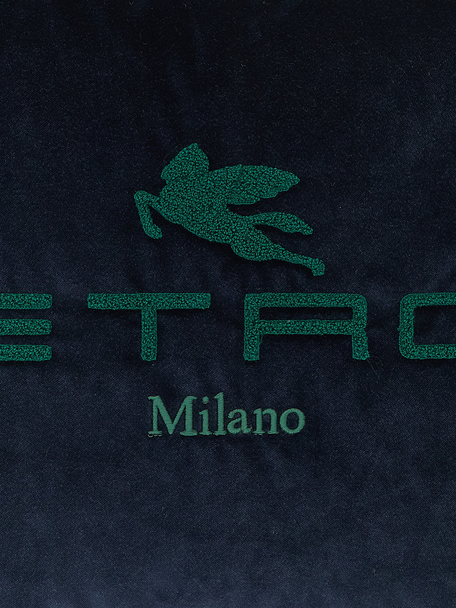 Peach and wool velvet cushion in cotton with front terry cloth logo embroidery, side zip closure.