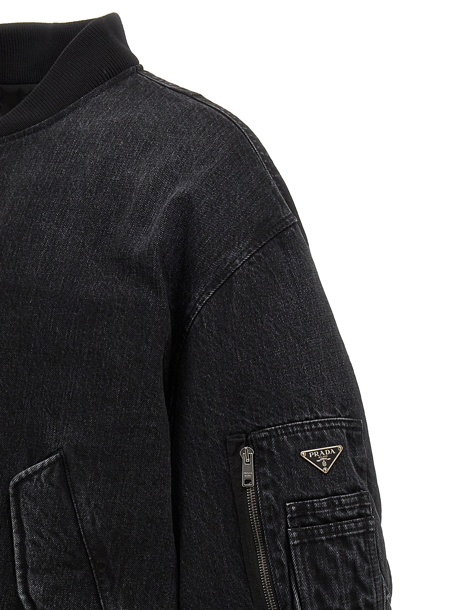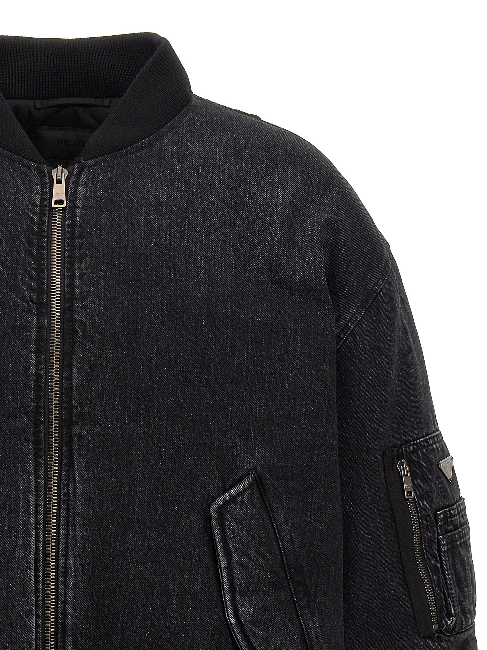 Padded cotton denim bomber jacket, zip closure, triangle enameled metal logo patch, pockets, long crinkled sleeves with knitted cuffs.