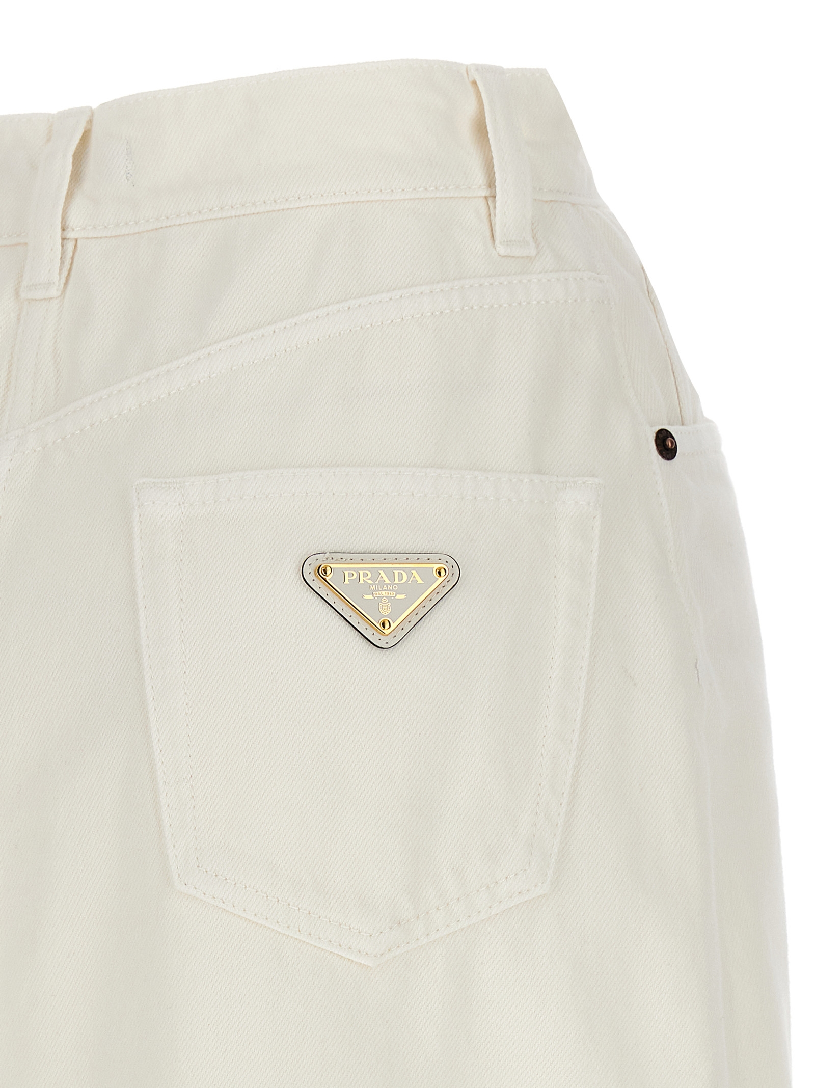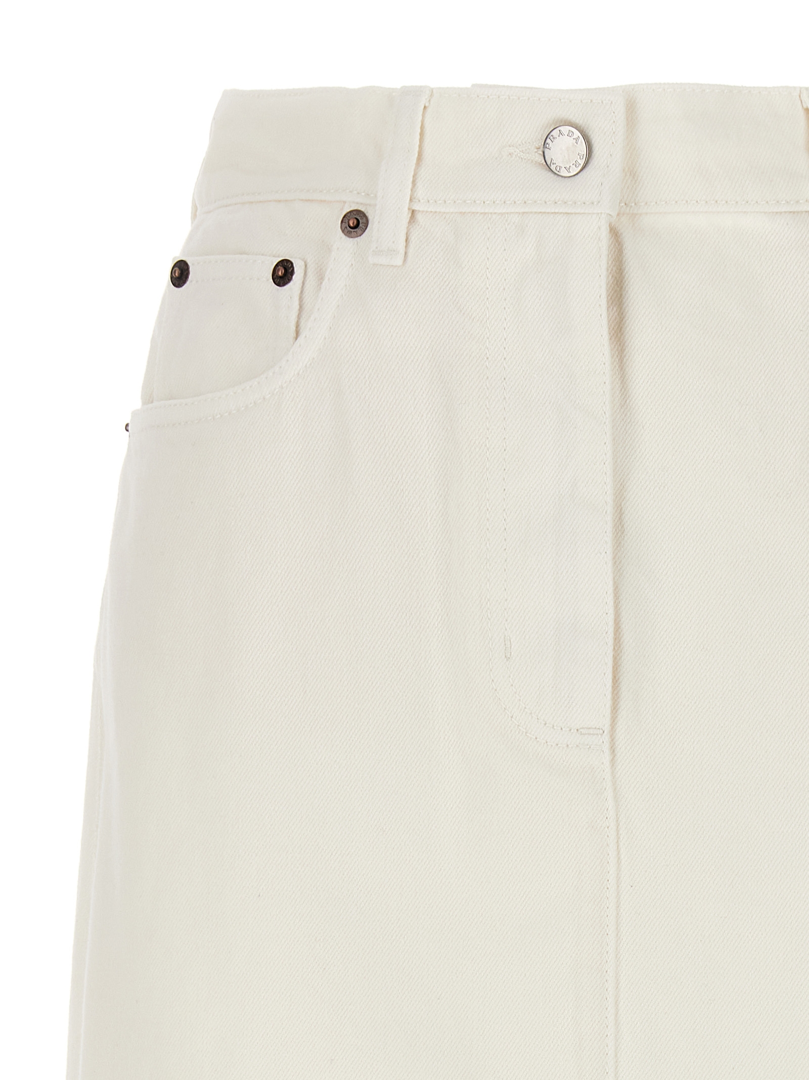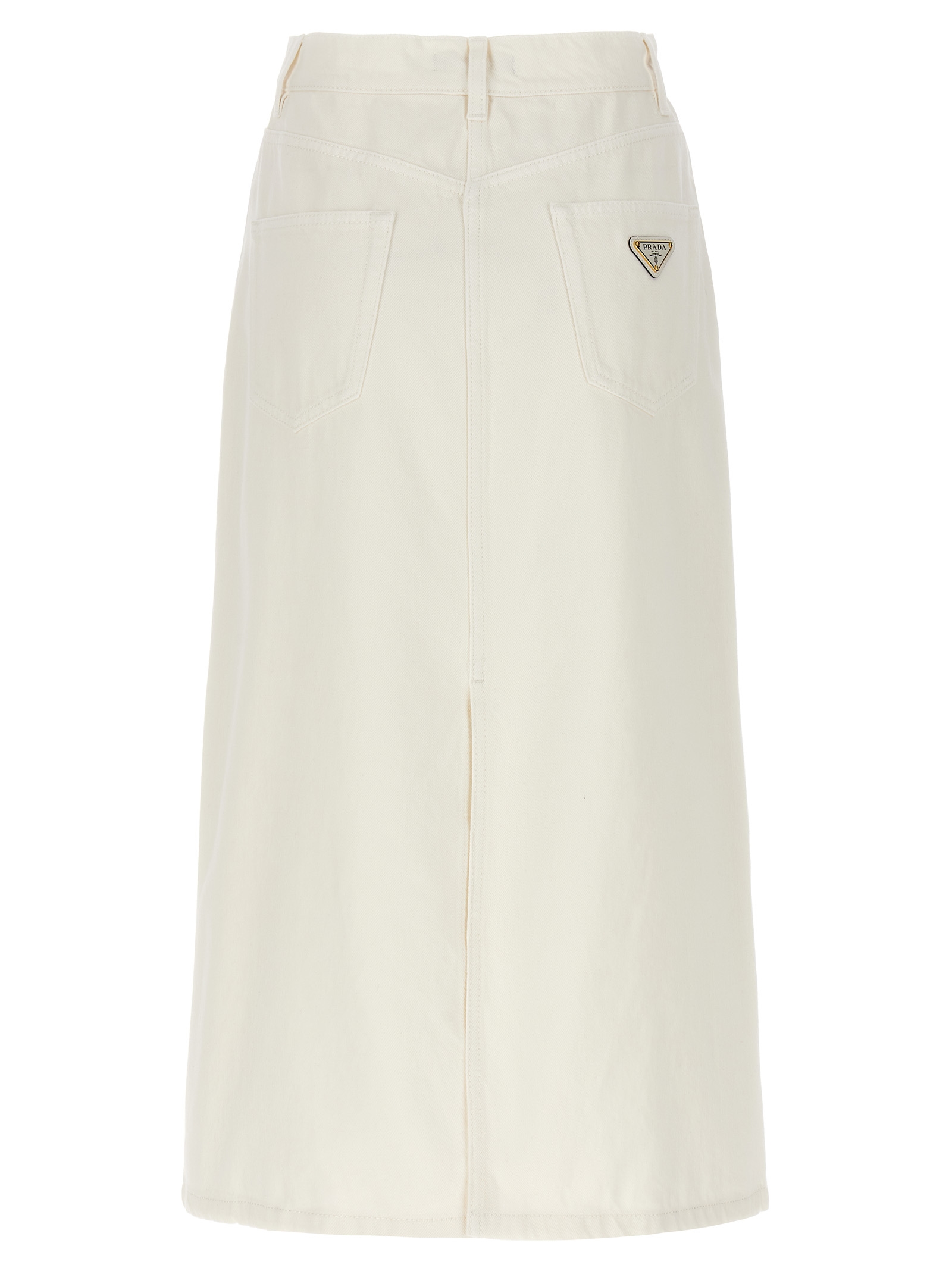 Midi skirt in cotton denim with triangle logo application in enameled metal, zip and button closure, five pockets, back split.