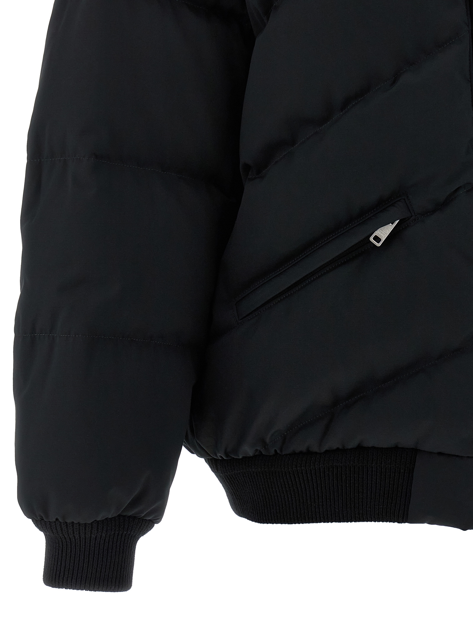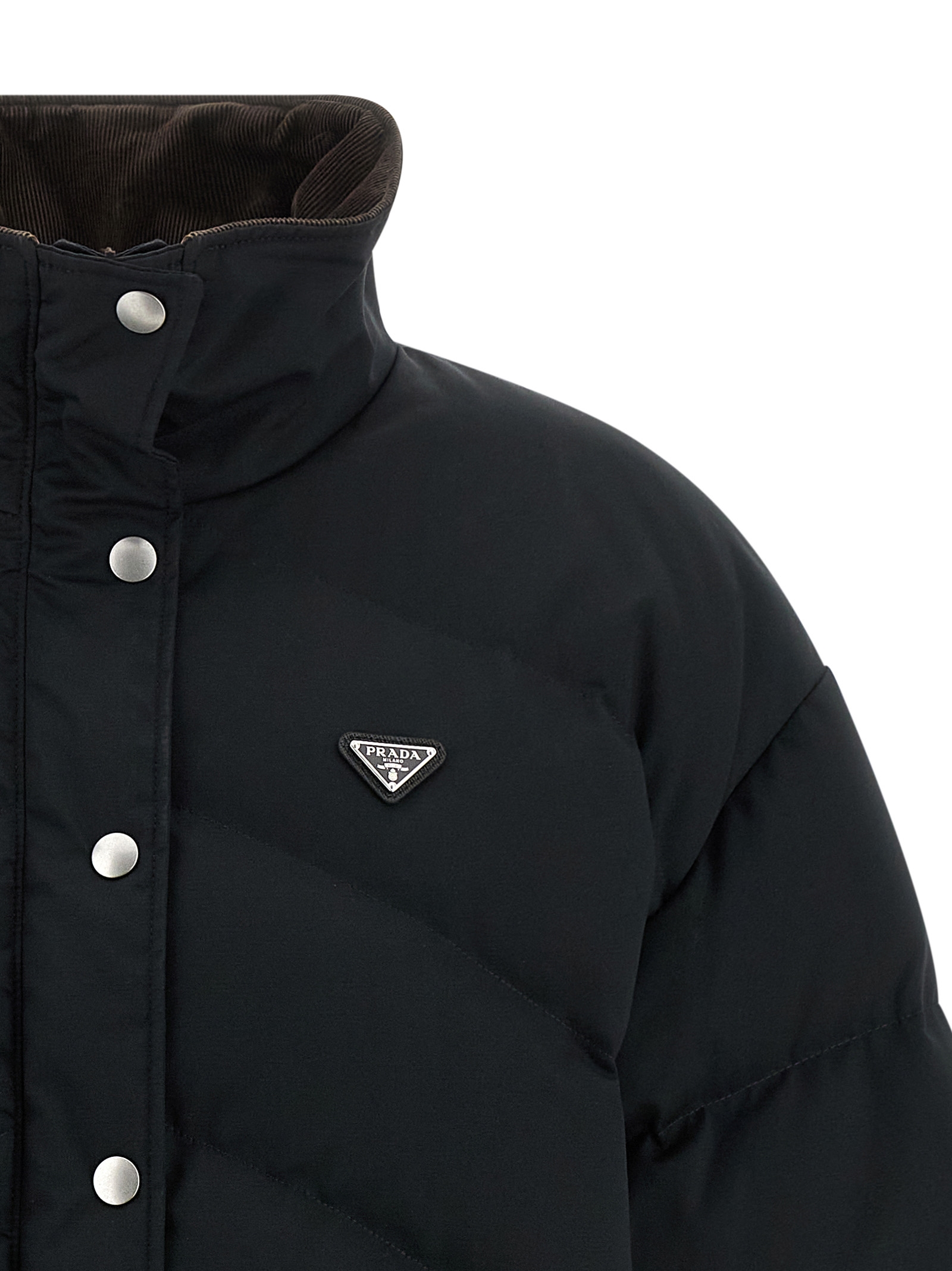 Quilted and quilted silk blend down jacket with goose feather padding, triangle logo in enameled metal on the front, standing collar with contrast corduroy lining, zip closure and front snap buttons, pockets, long sleeves with removable elastic cuffs, stretch ribbed knit band on the hem.