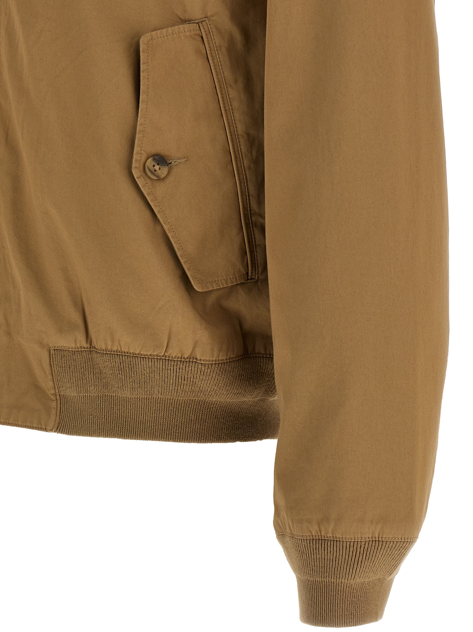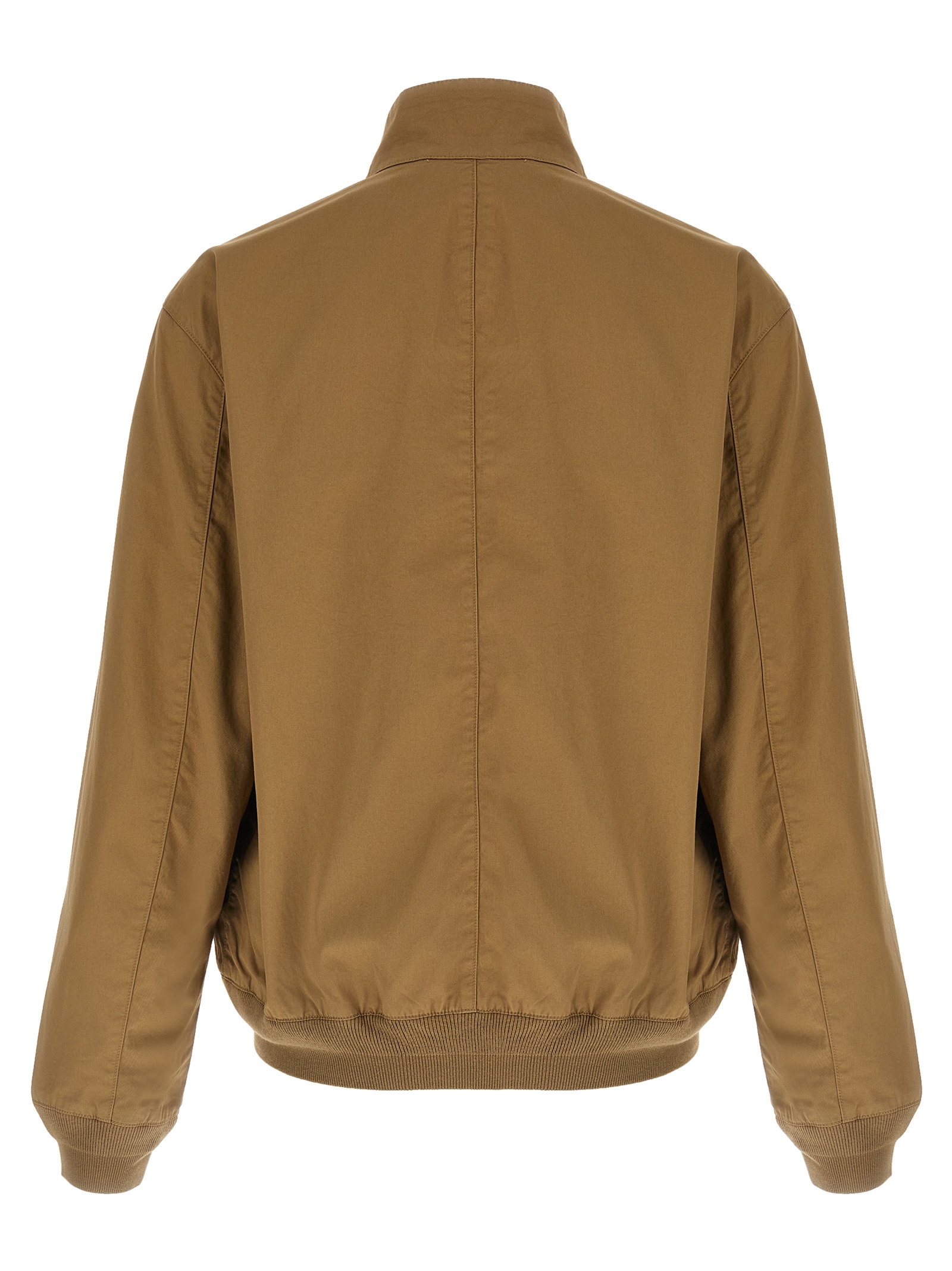 Cotton bomber jacket with front logo embroidery, zip closure, raised collar with buttons, pockets, long sleeves with knitted cuffs.