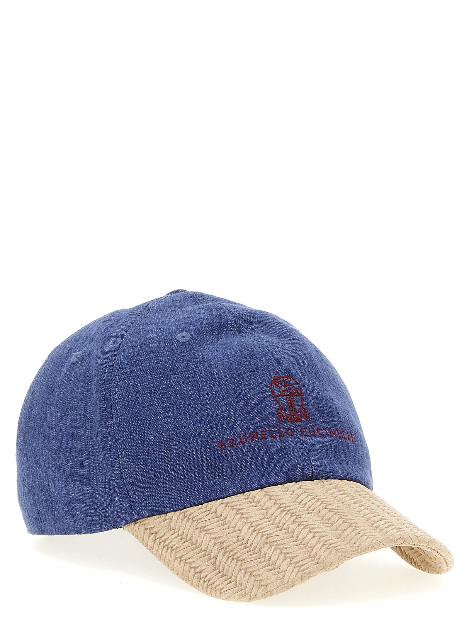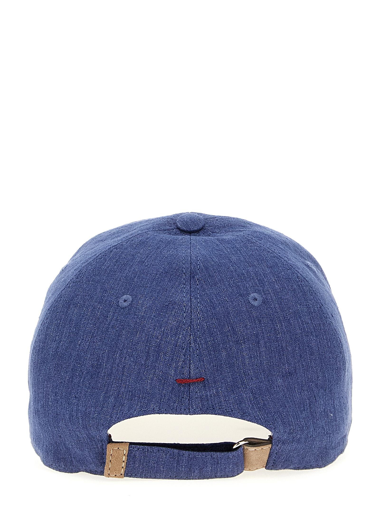 Denim print linen cap with contrasting logo embroidery on the front, woven suede visor, adjustable back strap.
