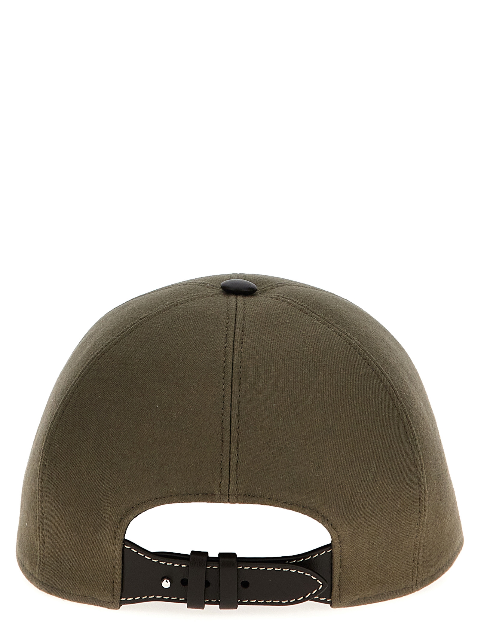 Cotton and cashmere cap with front embroidered logo, leather details, adjustable strap.