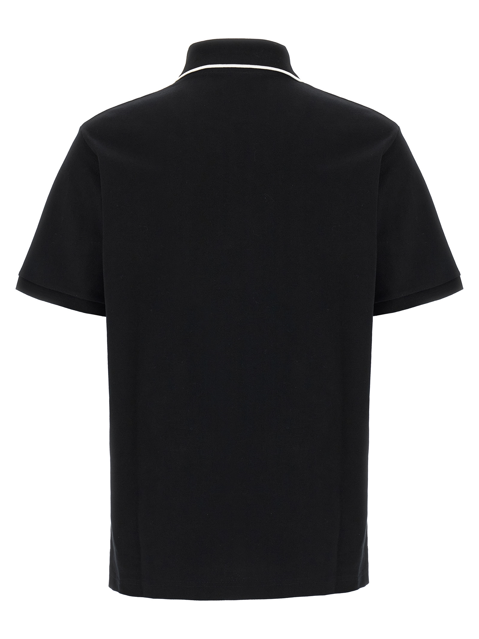 Piqué cotton polo shirt with contrasting details, front logo embroidery, collar and buttons, short sleeves with dropped shoulders, side slits, and asymmetrical hem.