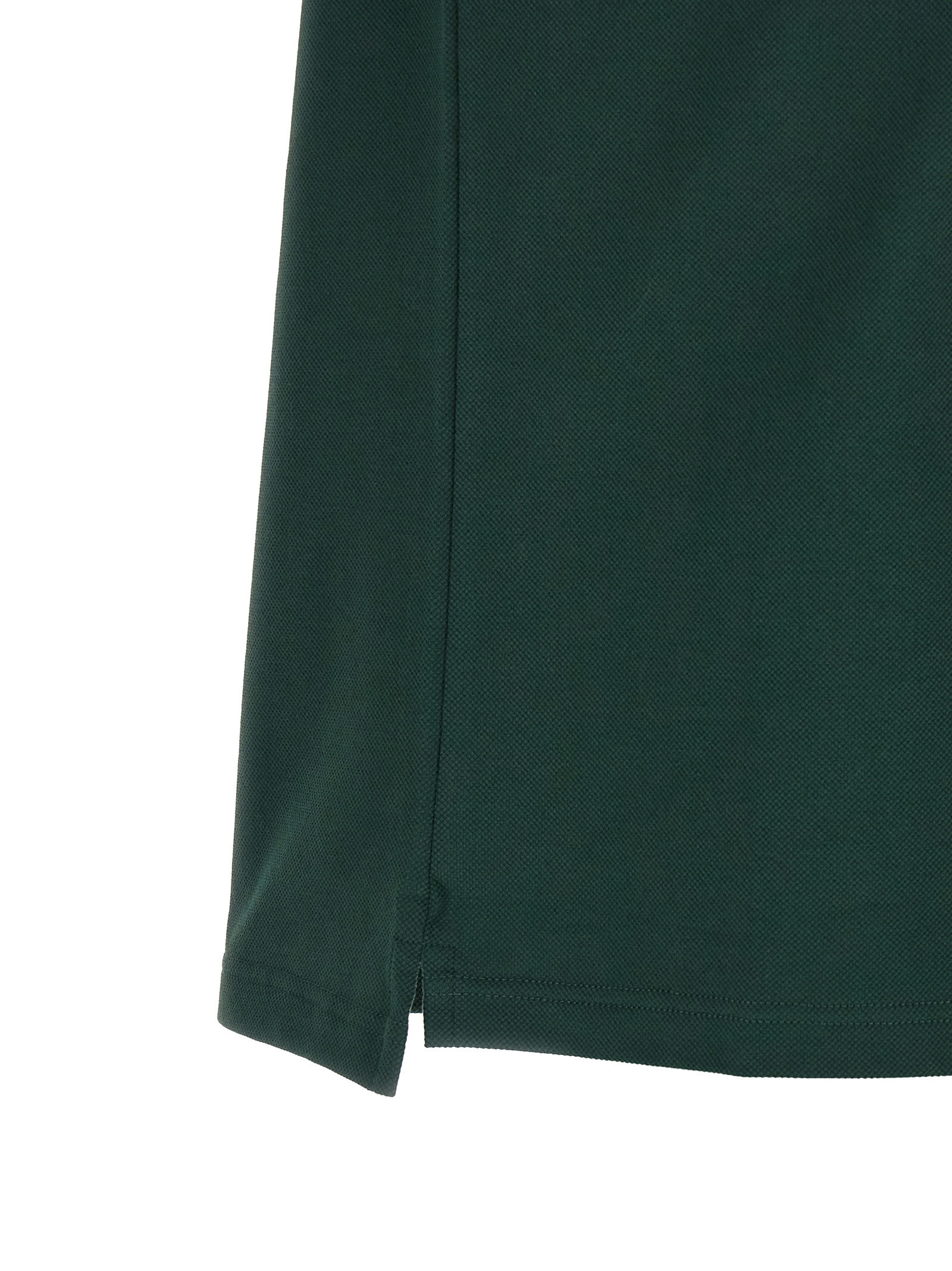 Stretch cotton piqué polo shirt with contrasting details, front logo embroidery, collar and buttons, short sleeves with dropped shoulders, side slits, and asymmetrical hem.