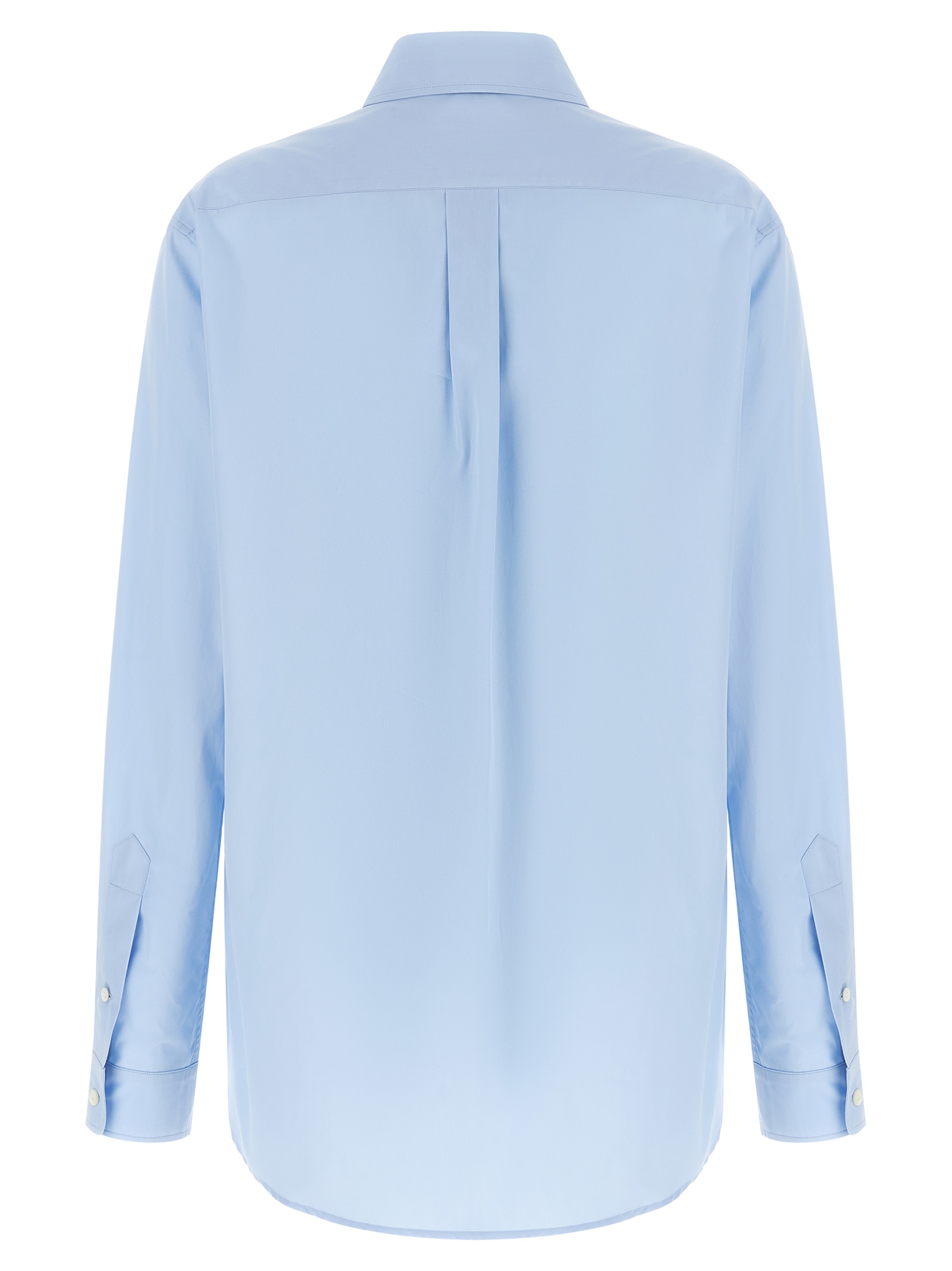Button-down cotton poplin shirt, tone-on-tone logo embroidery and front button closure, long sleeves with cuffs and dropped shoulders, back rack with cannon pleats, rounded hem.