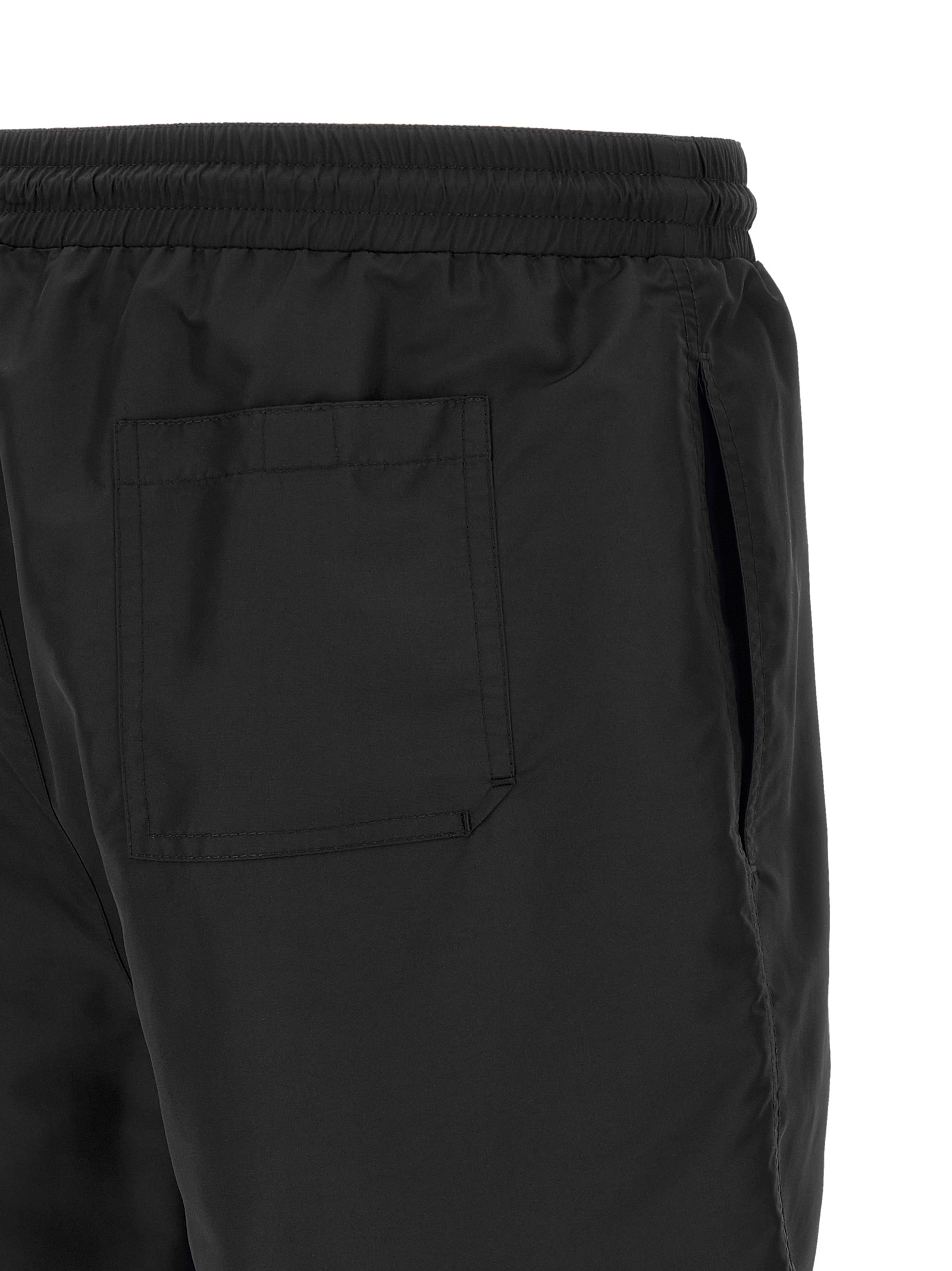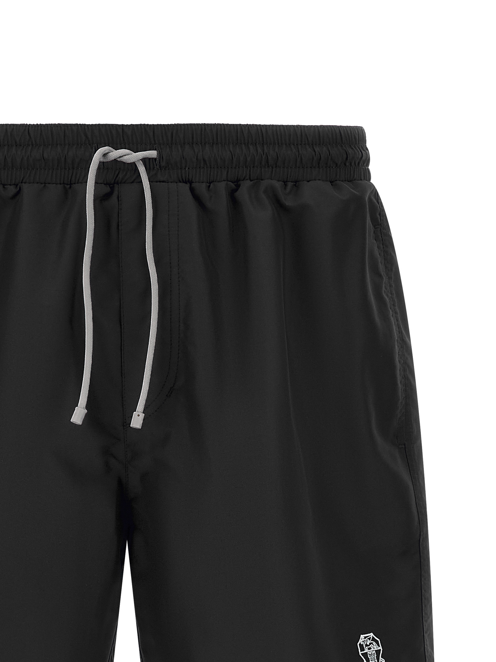 Matt nylon swimsuit, embroidered logo heraldic coat of arms of Solomeo on the front, elastic with drawstring at the waist, trompe l’oeil flap, pockets, inner mesh briefs.