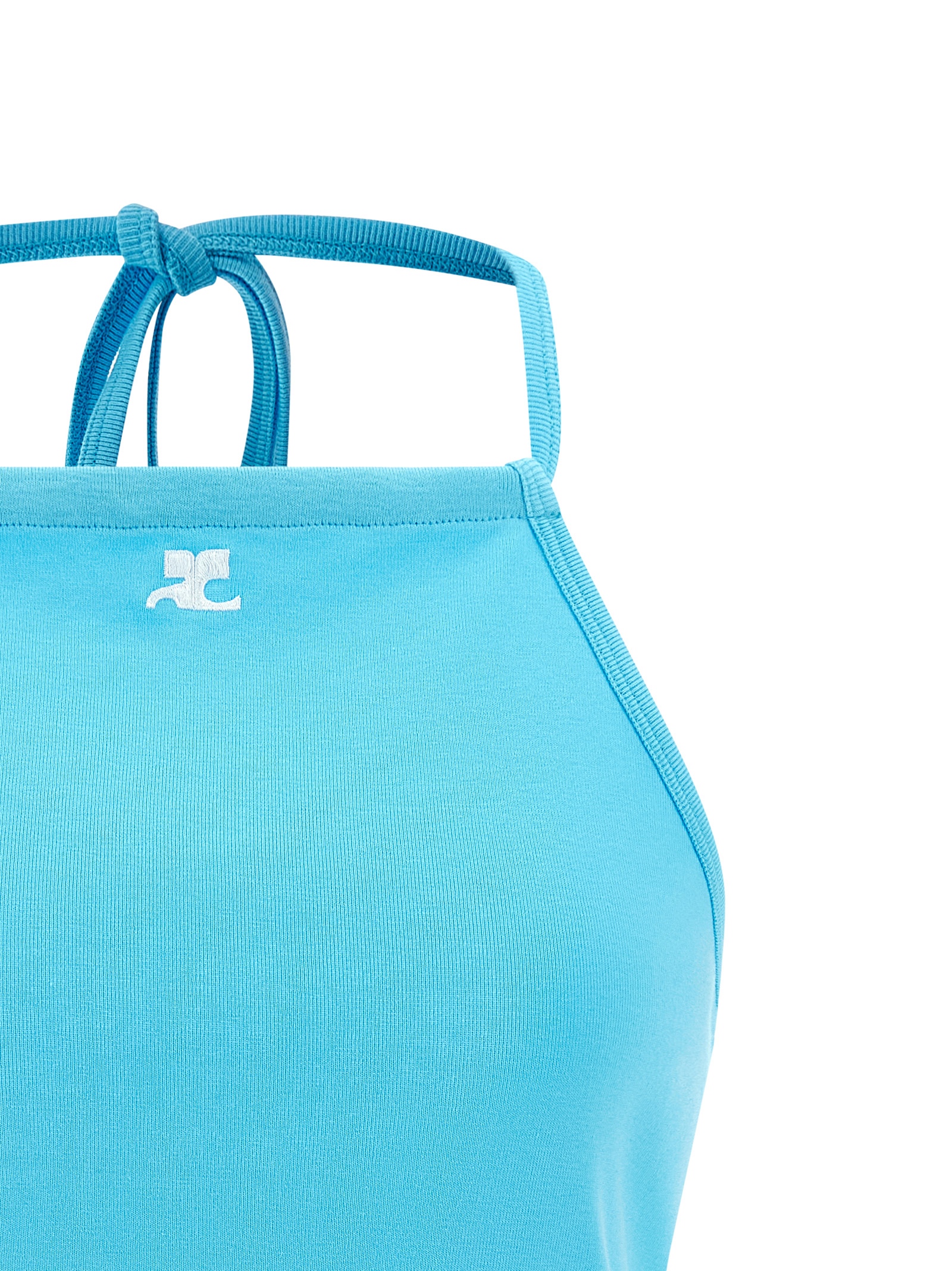 Cotton jersey tank top with contrasting logo embroidery on the front, American-style neckline, and drawstring to tie at the back of the neck.