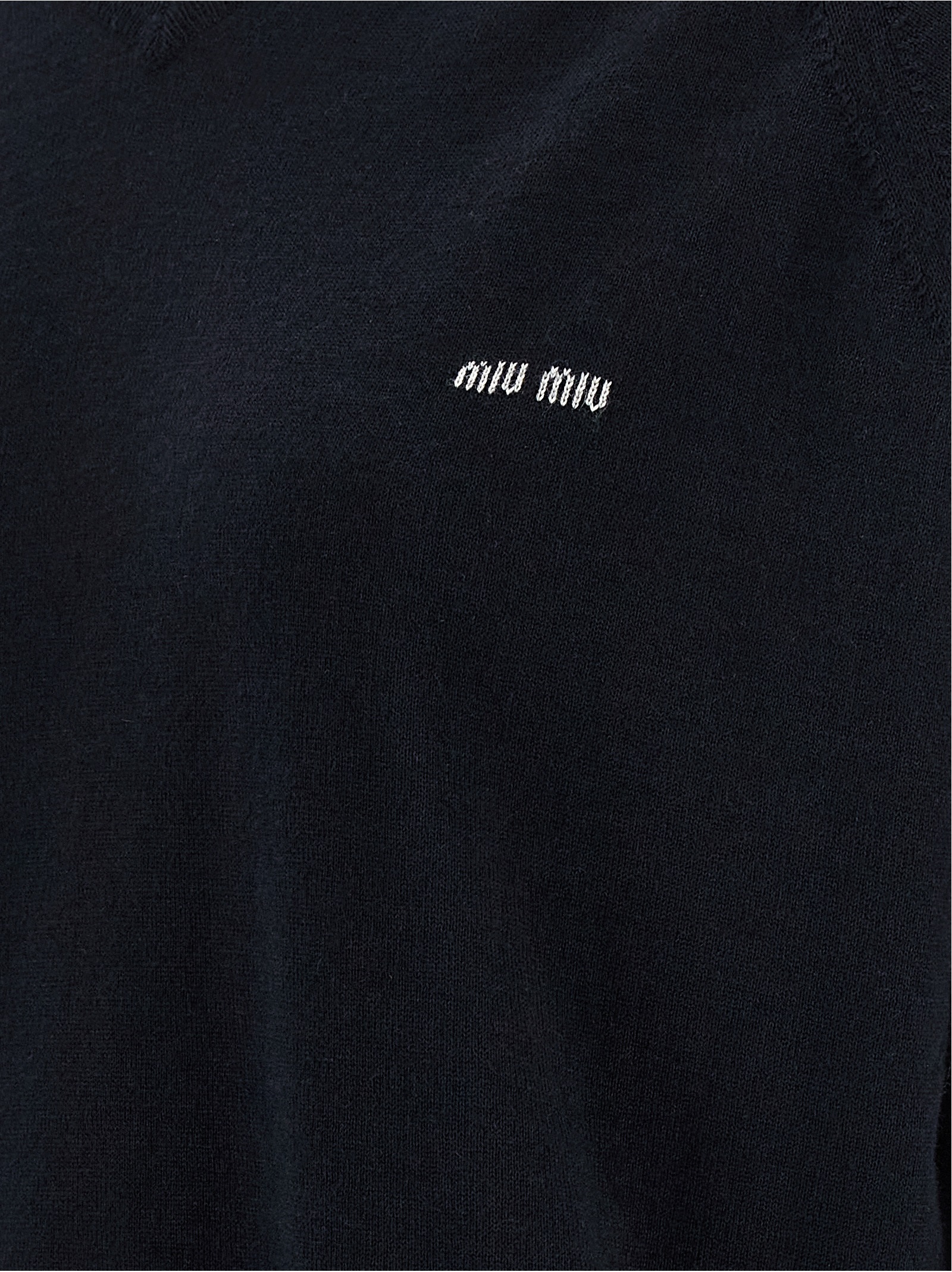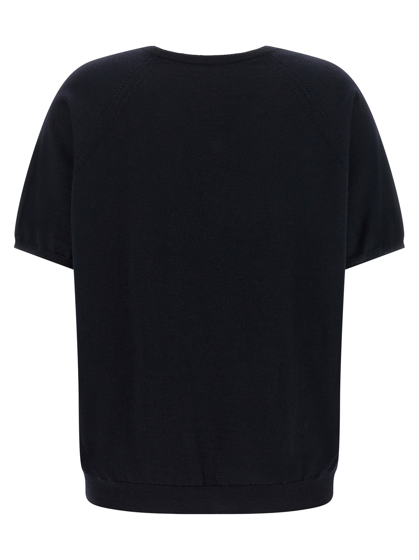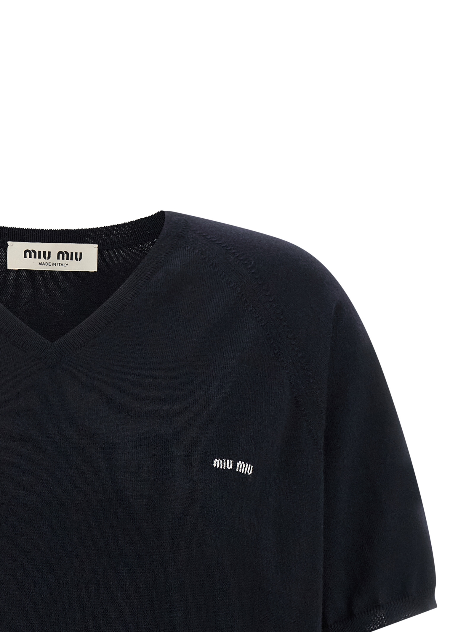 Light virgin wool sweater with front logo intarsia, V-neck, short raglan sleeves with cuffs, and headband.