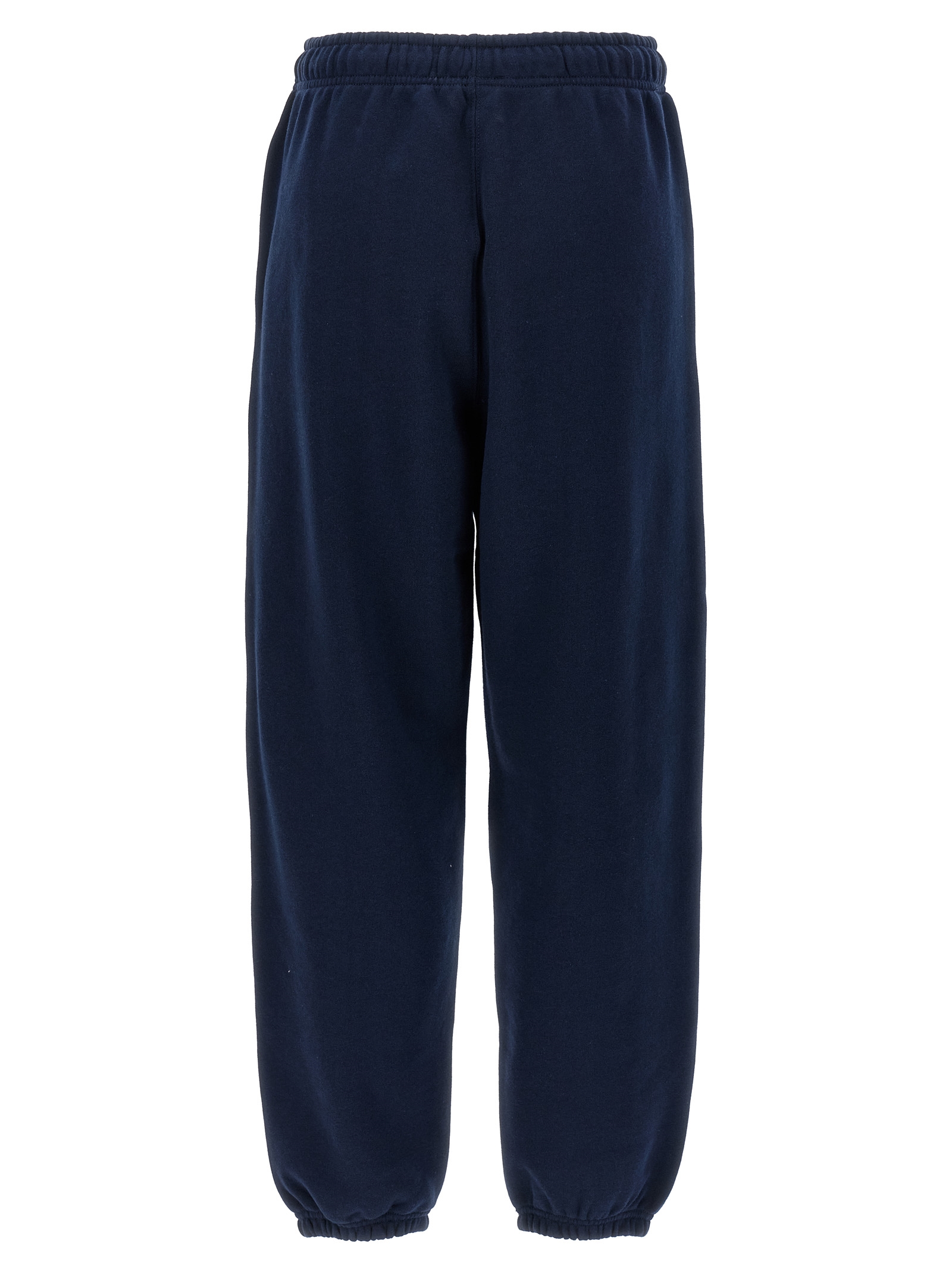 Fleece cotton joggers, front logo patch, adjustable drawstring elastic at the waist, pockets, straight leg, elastic ankle cuffs.
