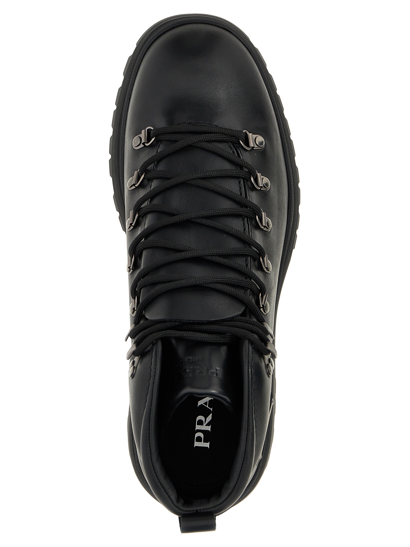 Leather ankle boots with triangle enameled metal logo appliqué on the side, laces and rubber sole.