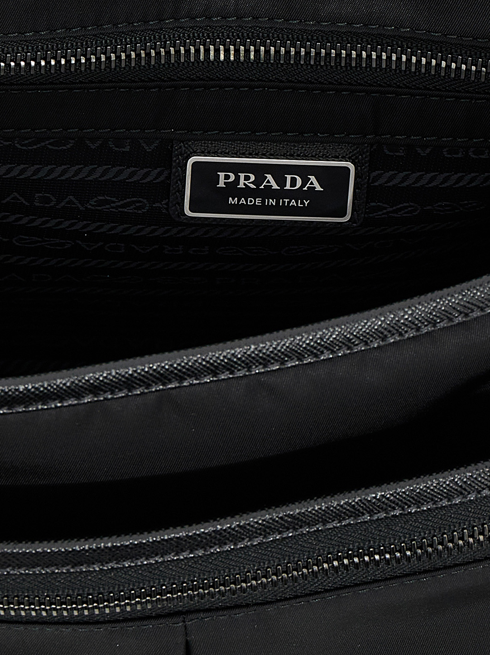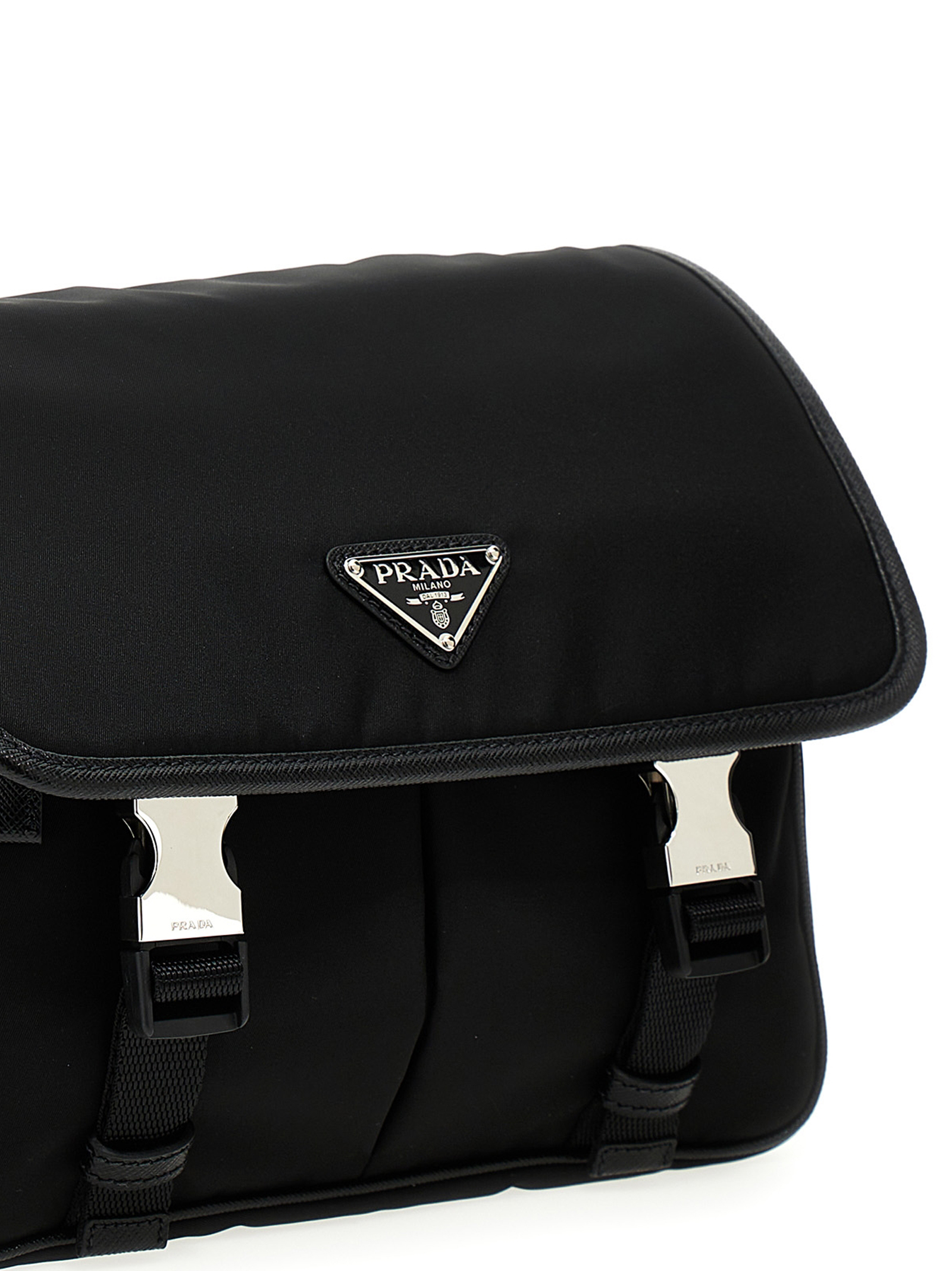 Nylon crossbody bag, with triangle metal enamel logo application, flap closure and buckles, adjustable shoulder strap and leather details.