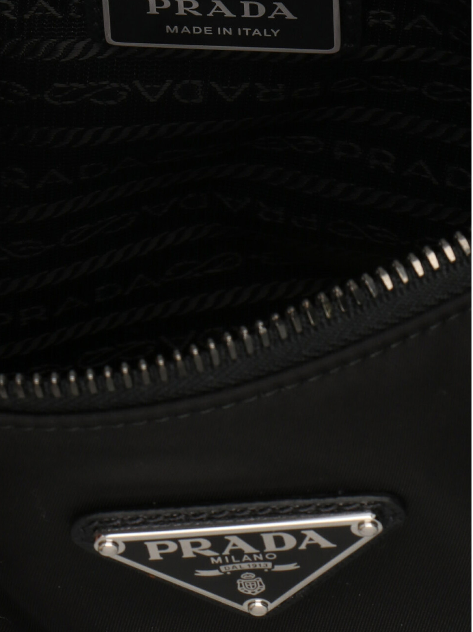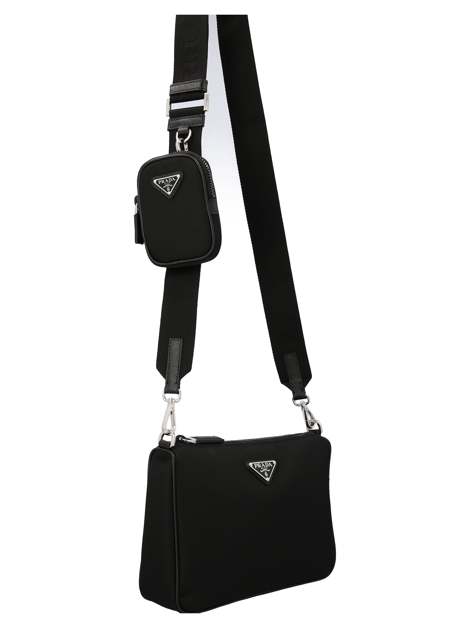 Nylon crossbody bag with saffiano leather details, front metal triangle logo, zip closure and awith adjustable and removable shoulder strap.