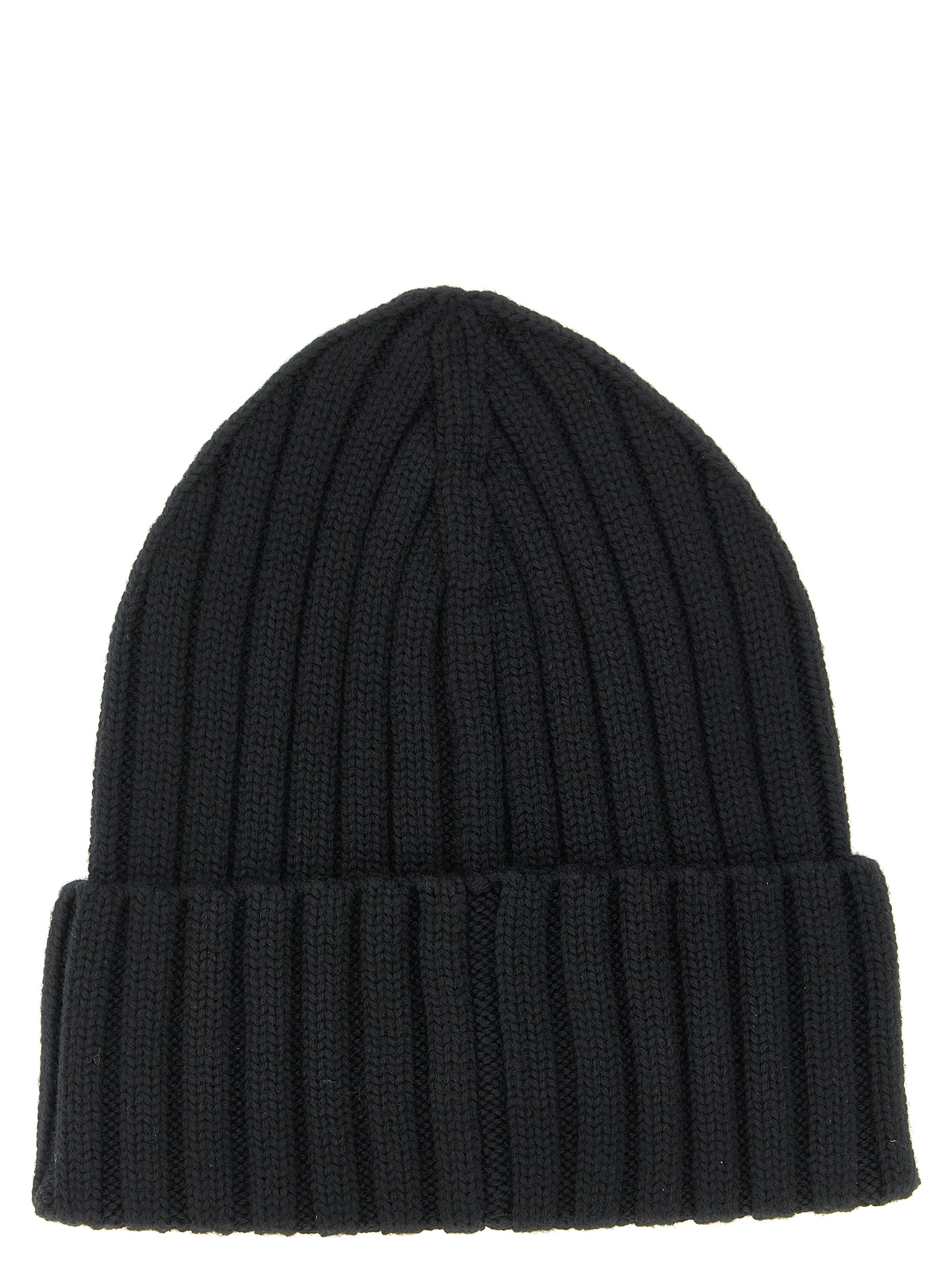 Virgin wool ribbed knit beanie with turn-up with front felt logo patch.