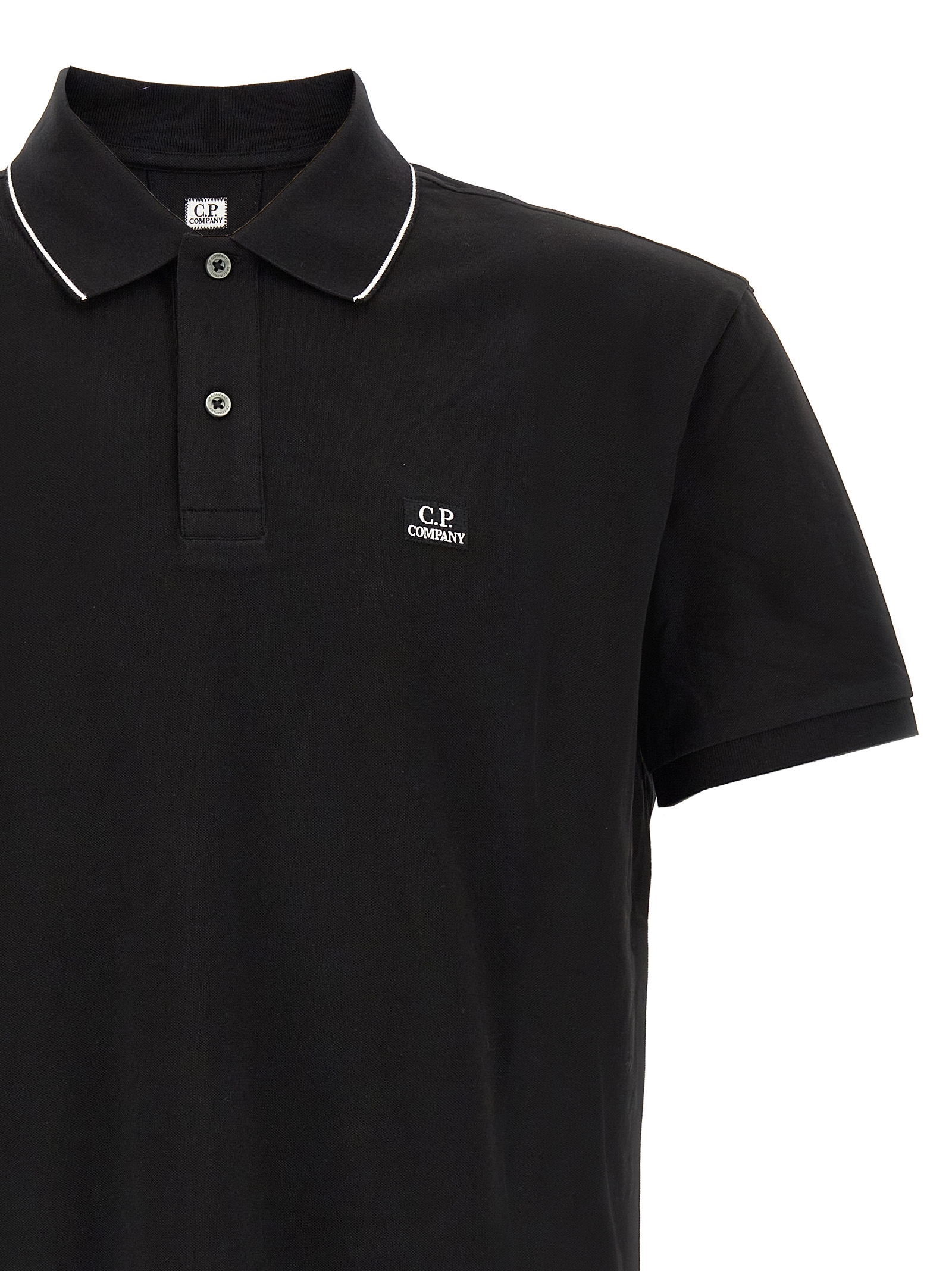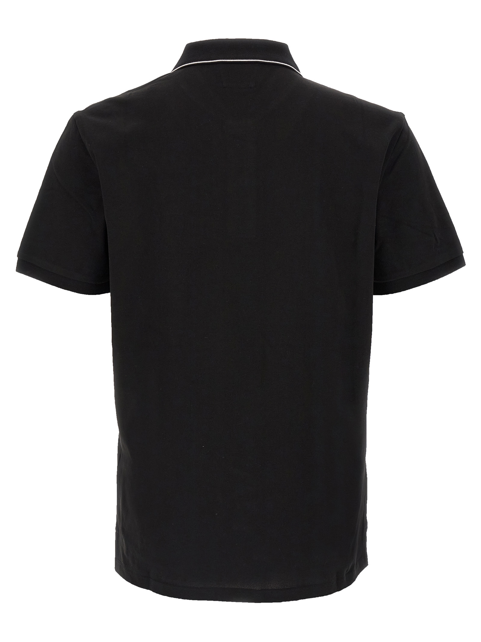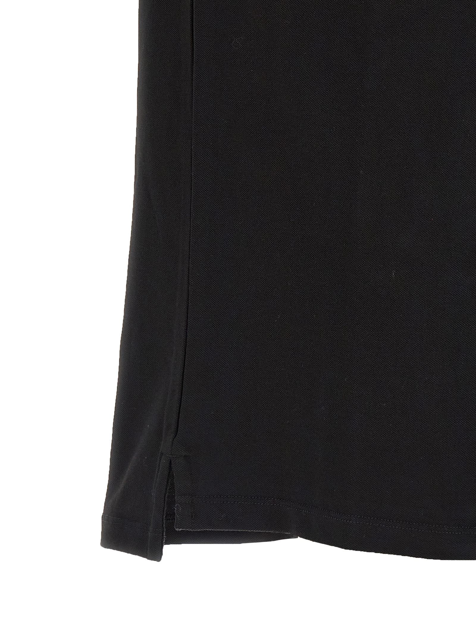 Stretch cotton piquet polo shirt with front logo patch, collar with contrasting detail and buttons, short sleeves with cuffs, side slits on an asymmetrical hem.