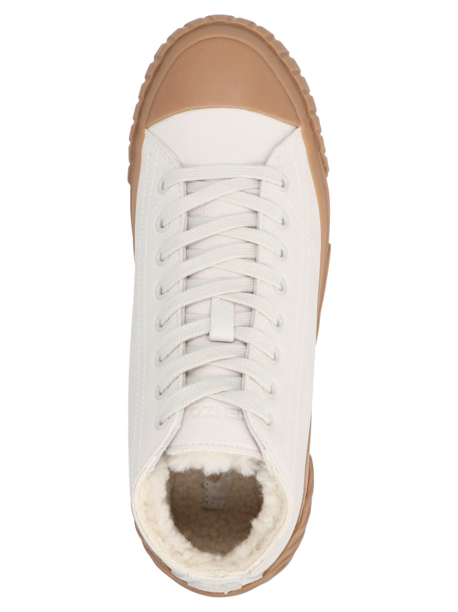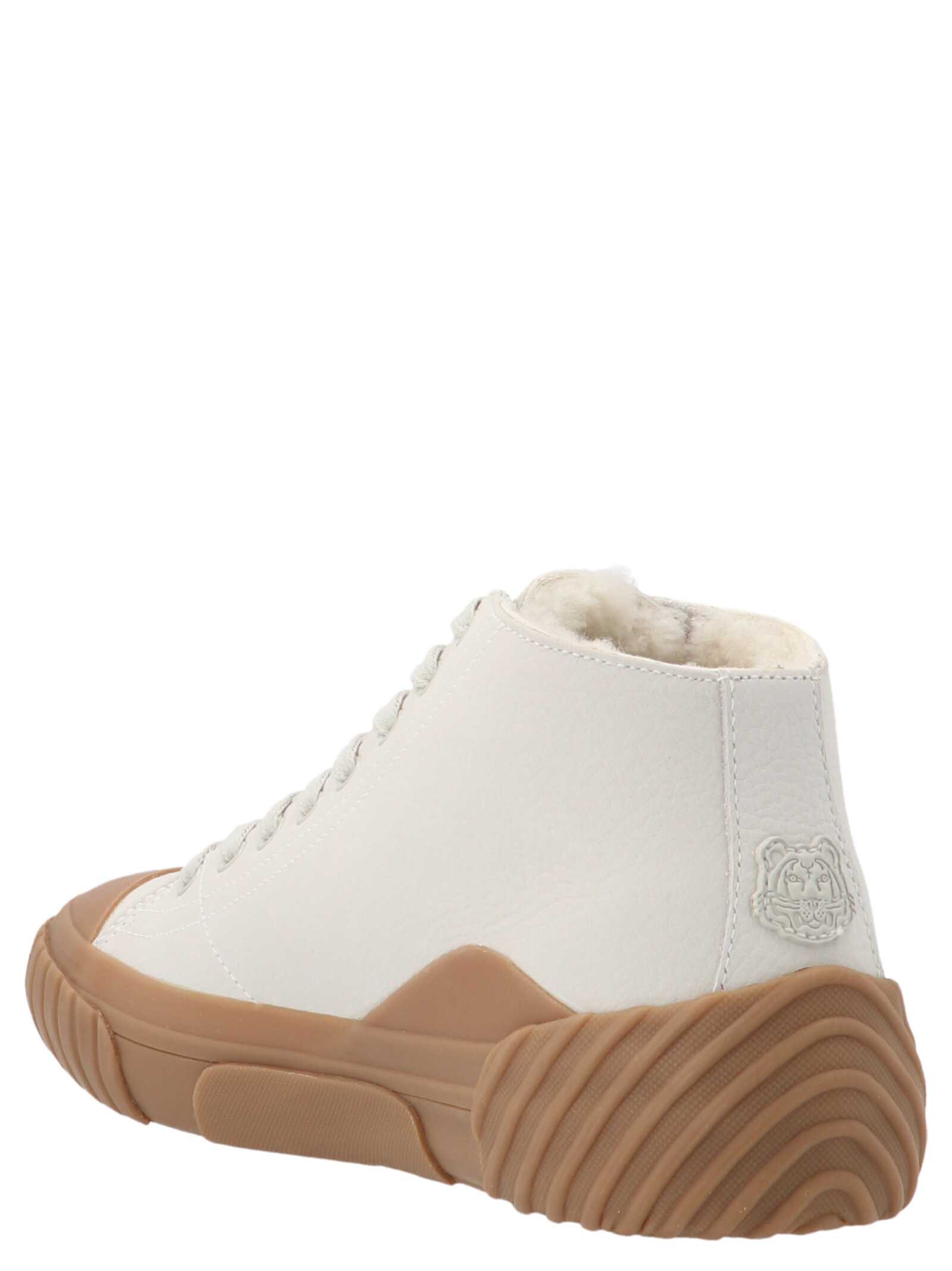 High-top lace-up sneakers with logo patch and rubber sole.