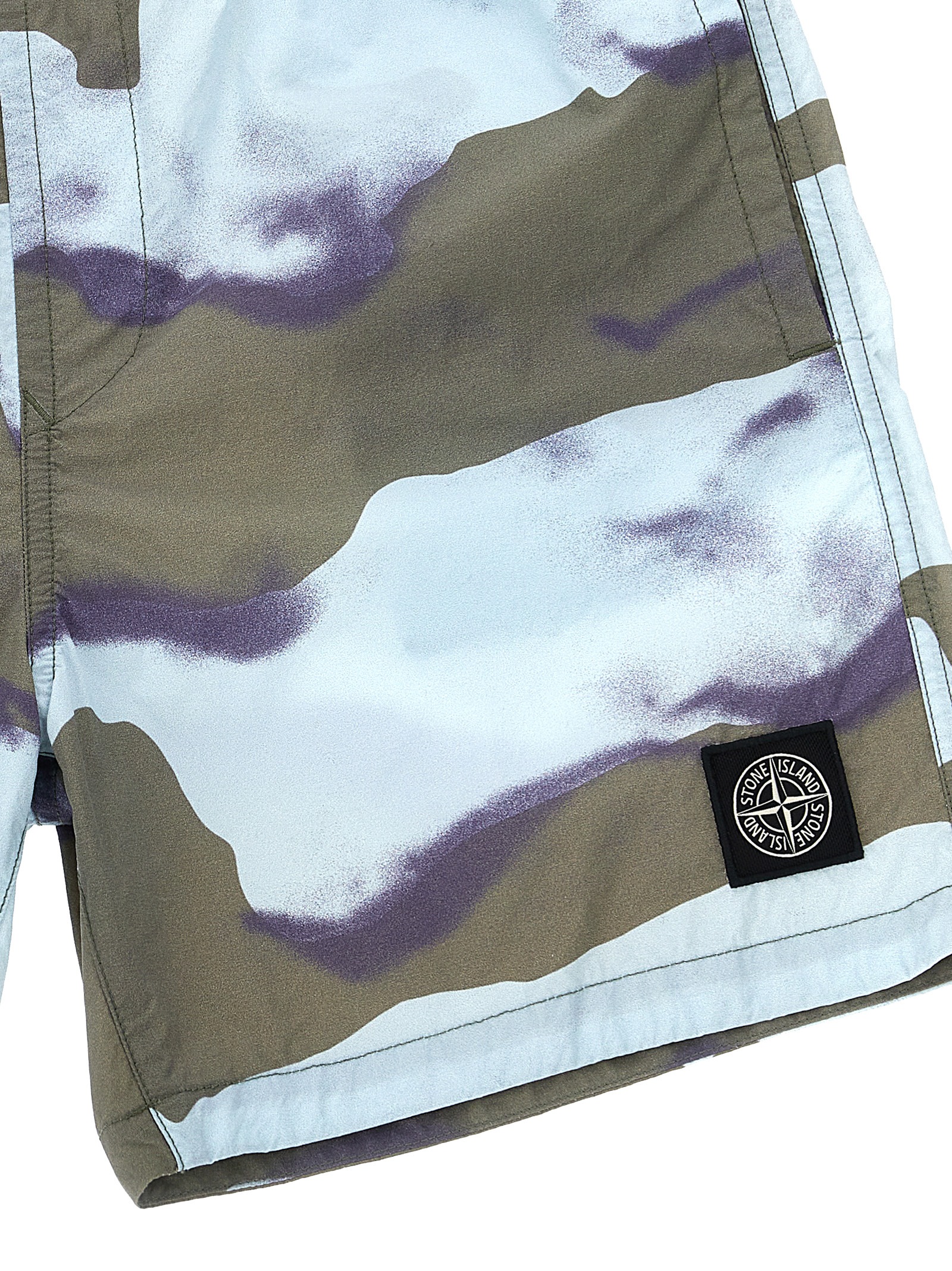 Patterned technical fabric swimsuit, front logo patch, adjustable drawstring elastic at the waist, pockets, inner mesh briefs.
