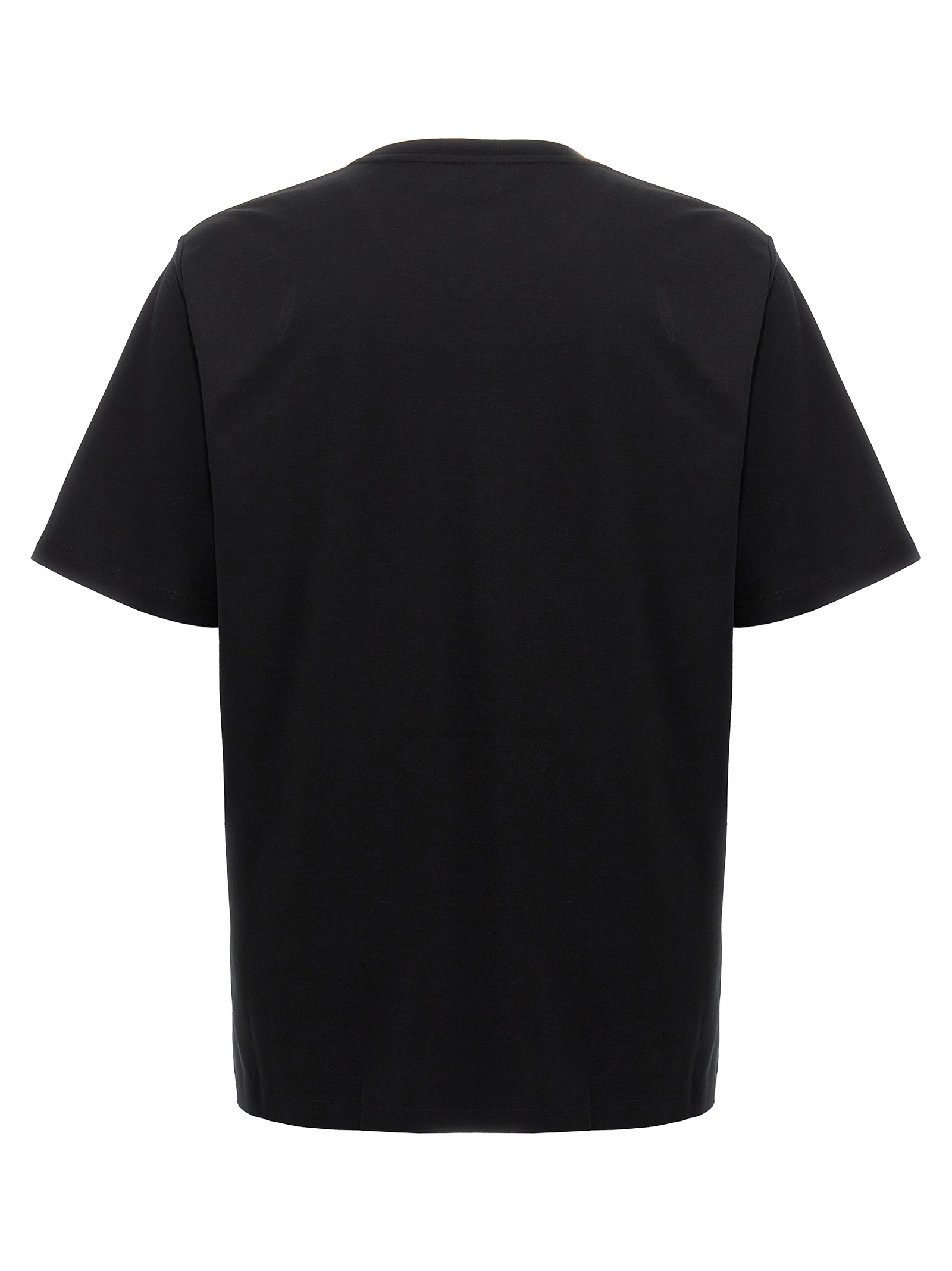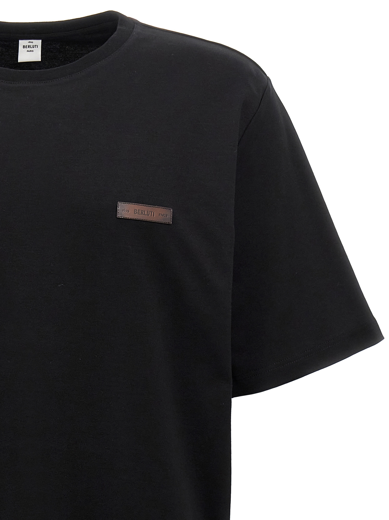 Cotton T-shirt with front leather logo patch, crew neck, short sleeves.
