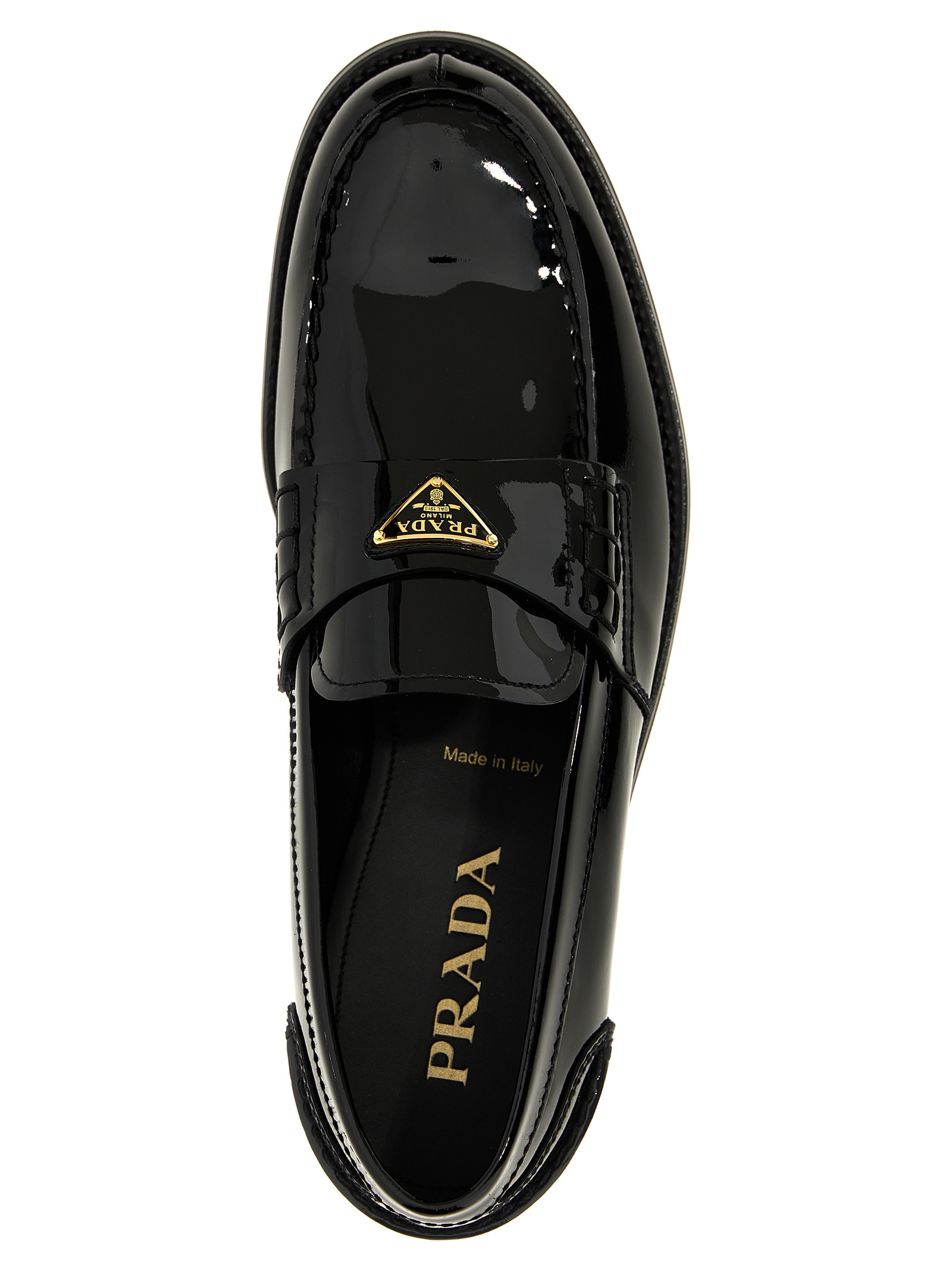 Patent leather loafers, triangle enameled metal logo appliqué on the front, rubber sole.