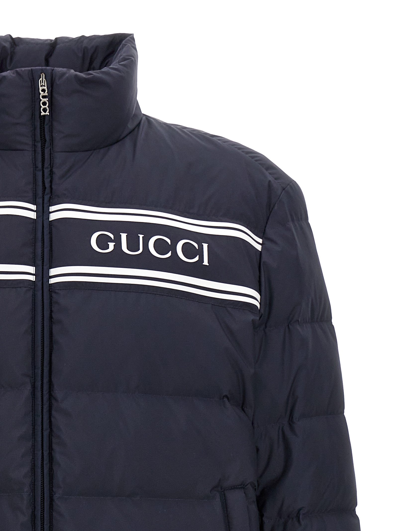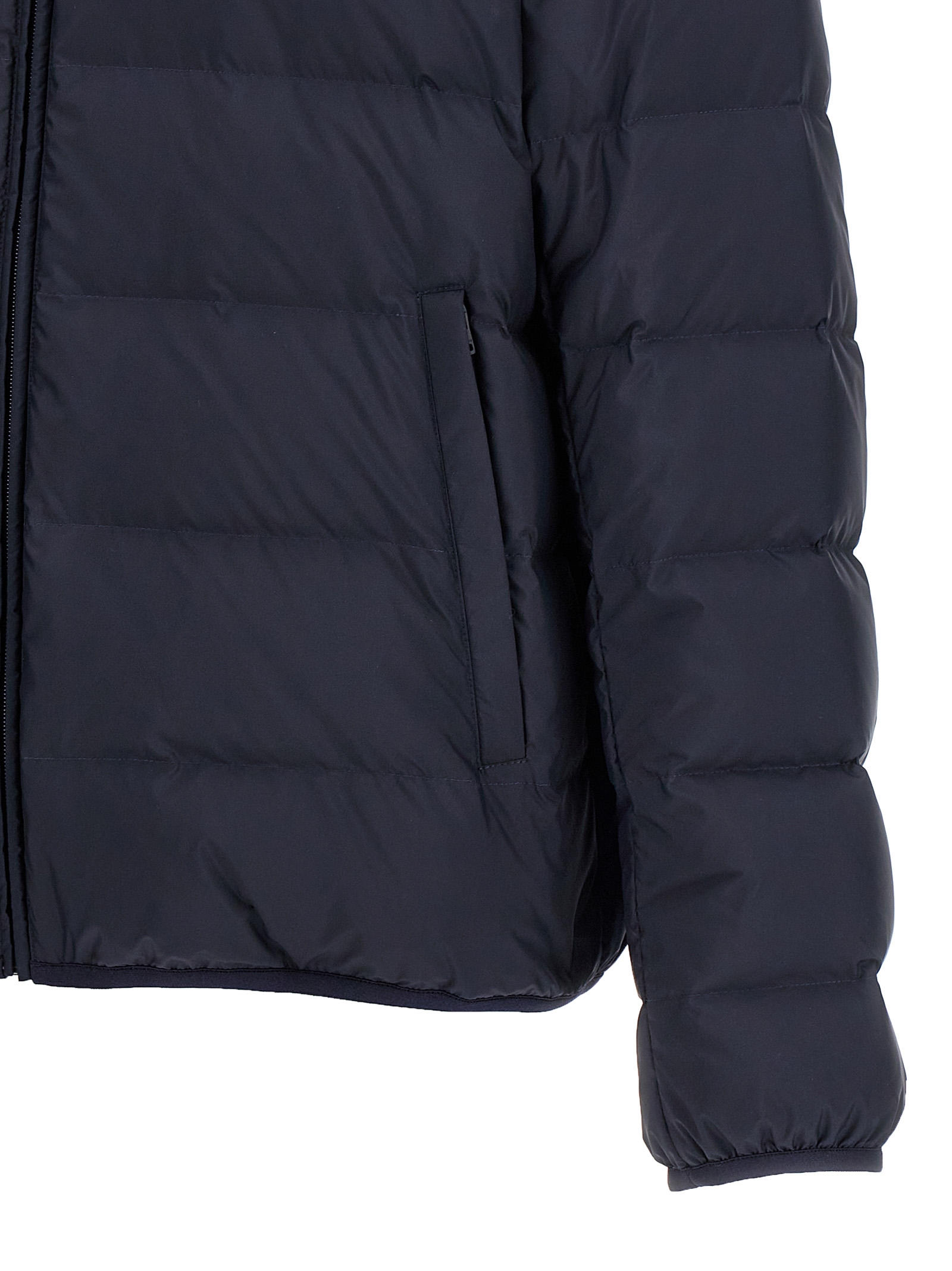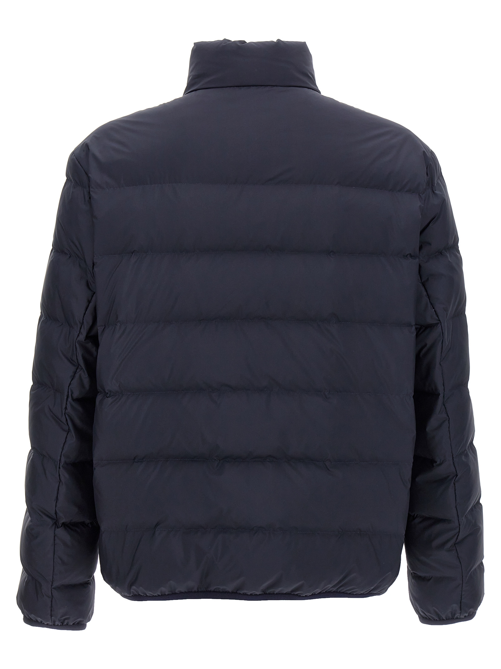 Nylon down jacket, down padding, logo print, zip closure, pockets, long sleeves.
