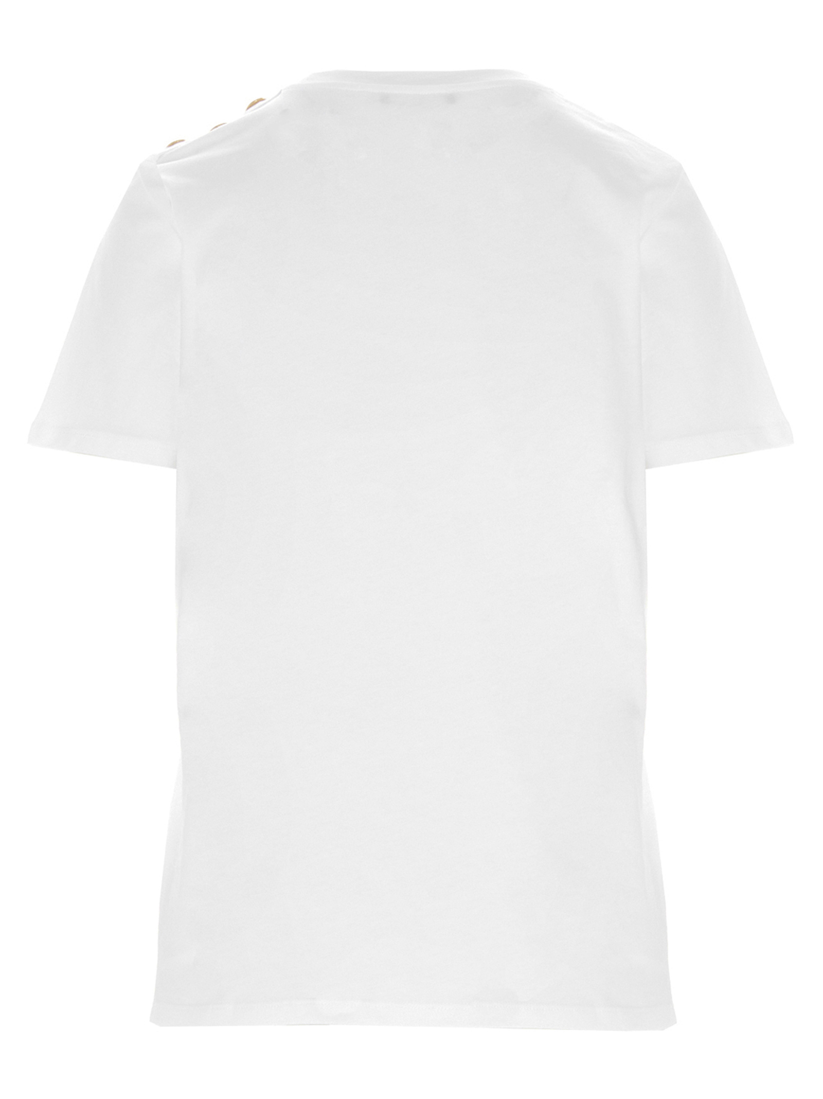 Cotton, crewneck t-shirt with front logo print, logo buttons on the shoulder, and short sleeves.