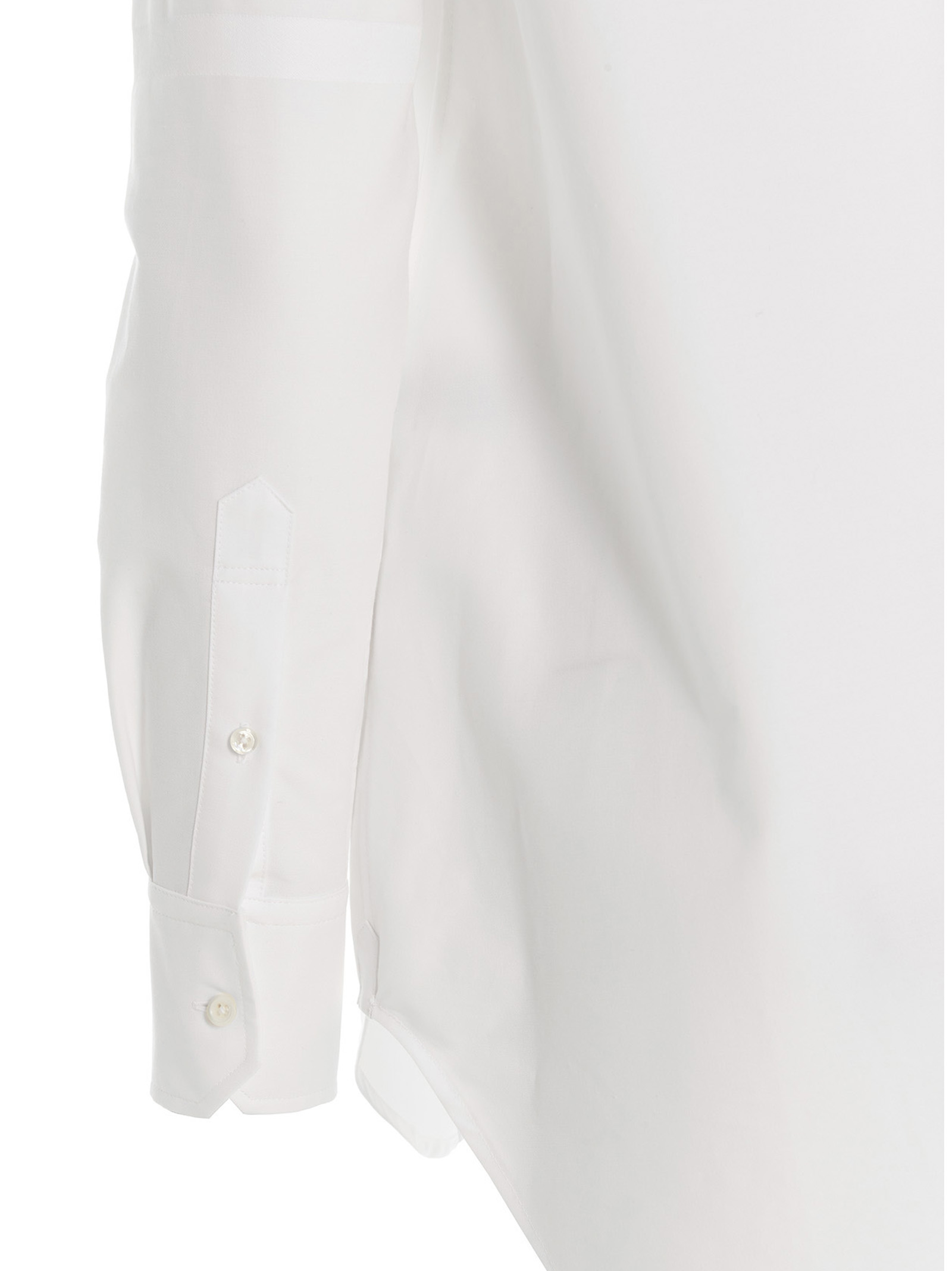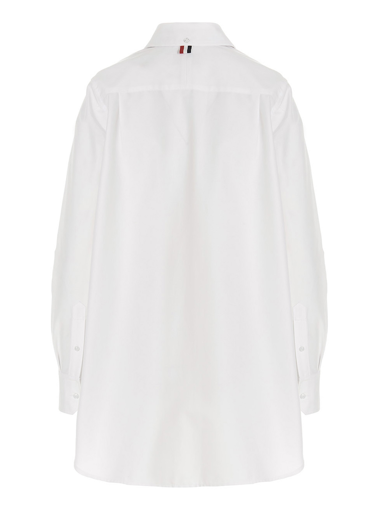 Supima cotton blouse with a pussy bow detail in the iconic colors, a front logo patch, a buttoned neckline and long cuffed sleeves.