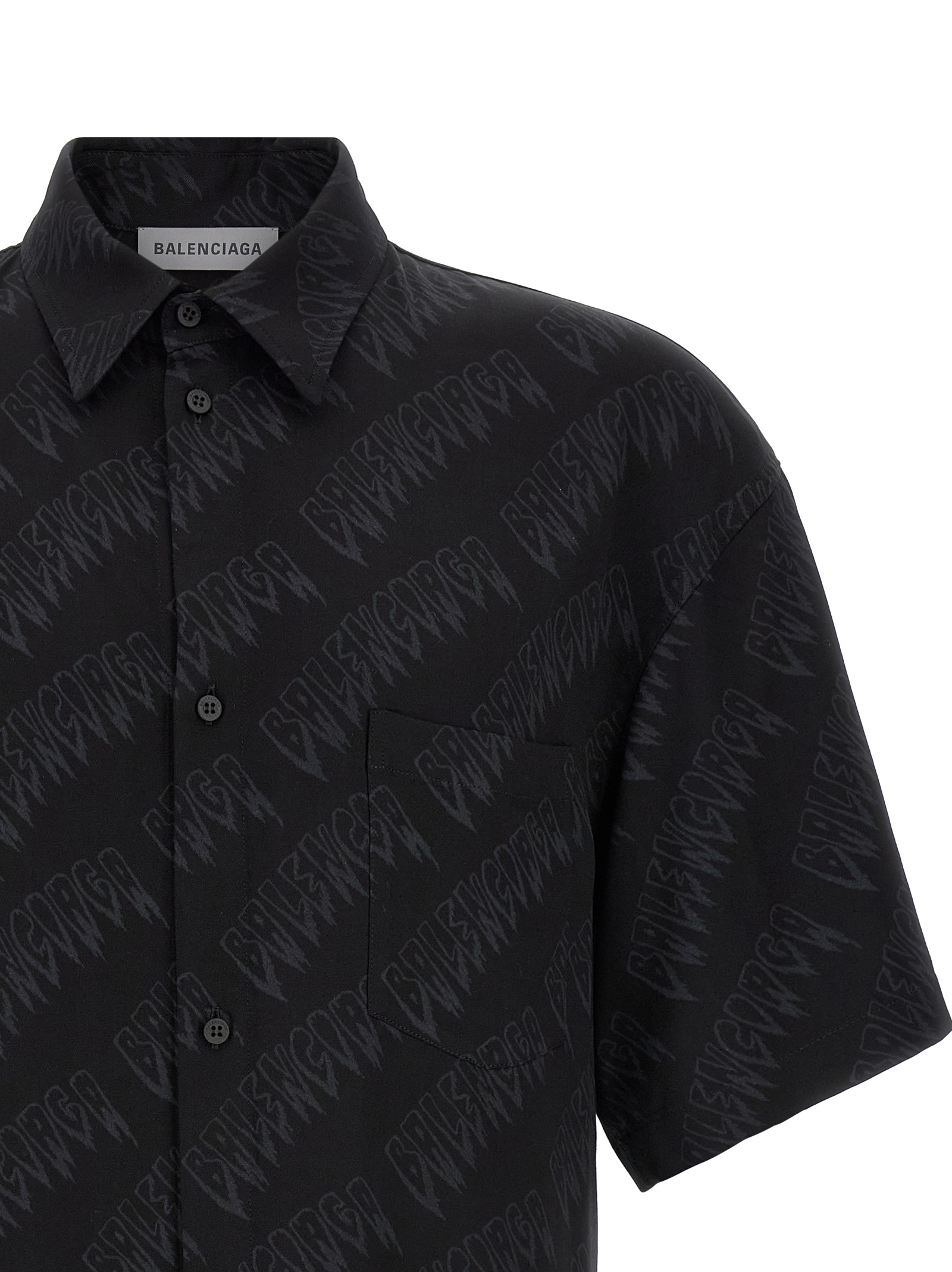 Fluid viscose shirt with all-over logo print, pointed collar, chest pocket, front button closure, short sleeves with dropped shoulders.