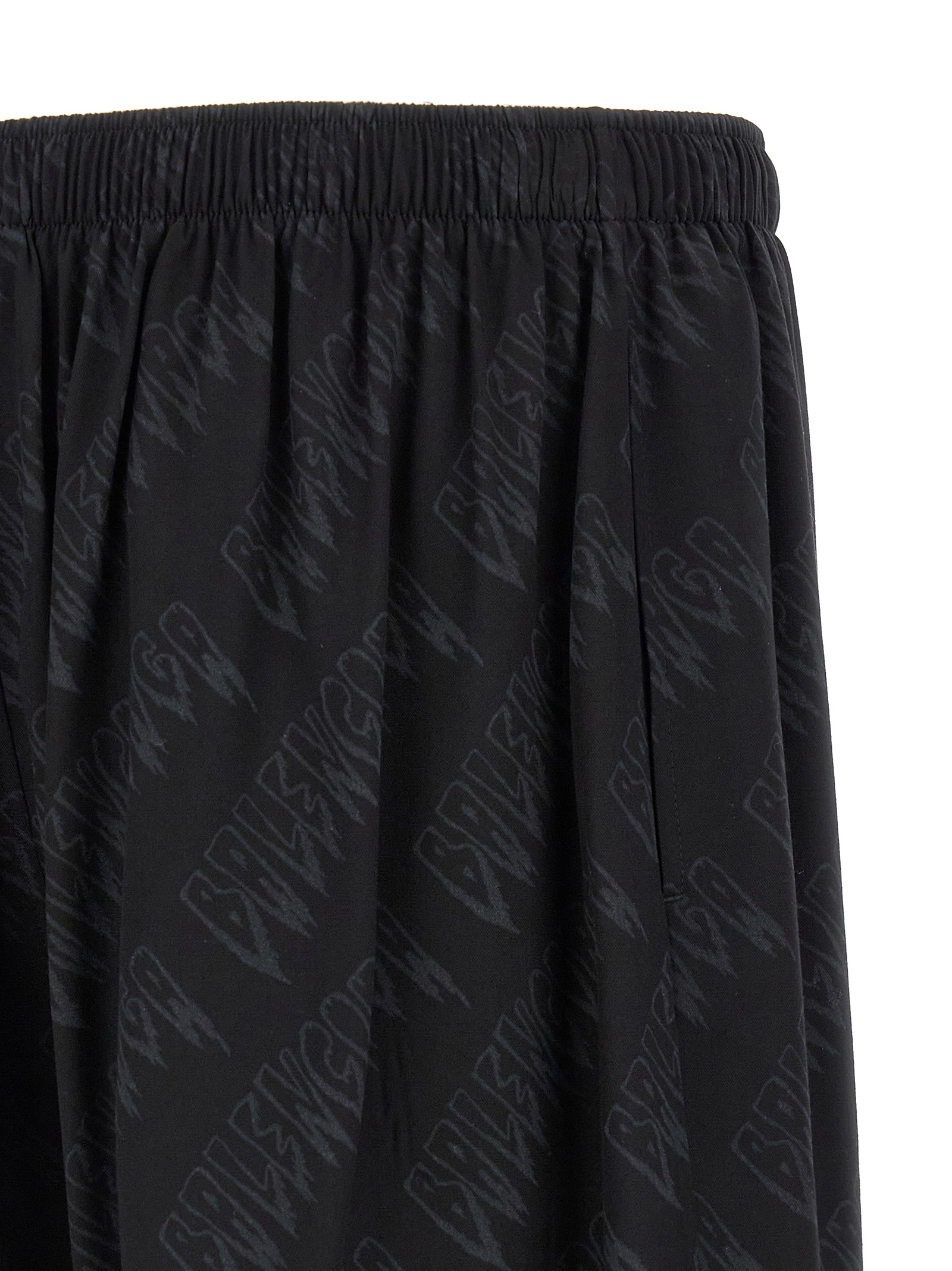 Fluid viscose shorts with all-over logo print, wide leg, elastic waistband, button flap, pockets.