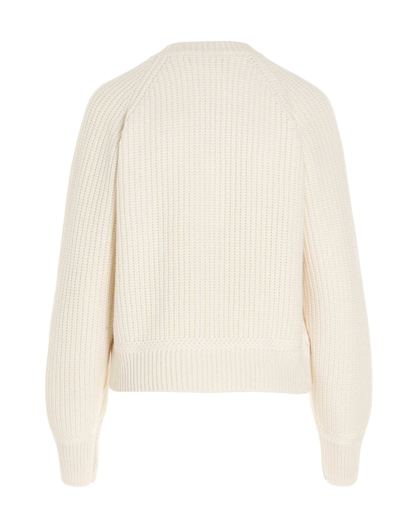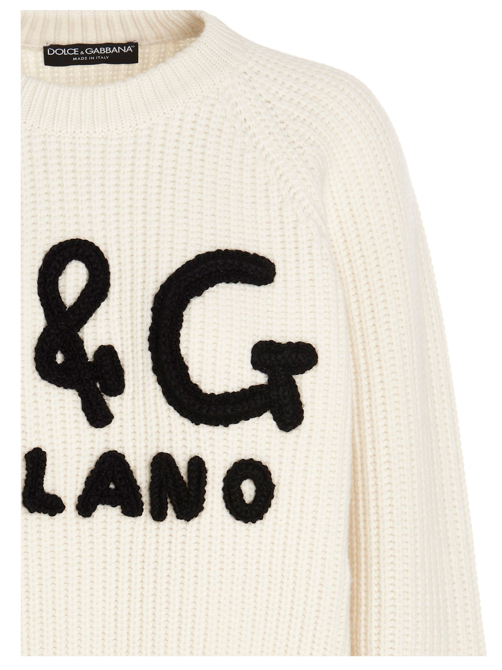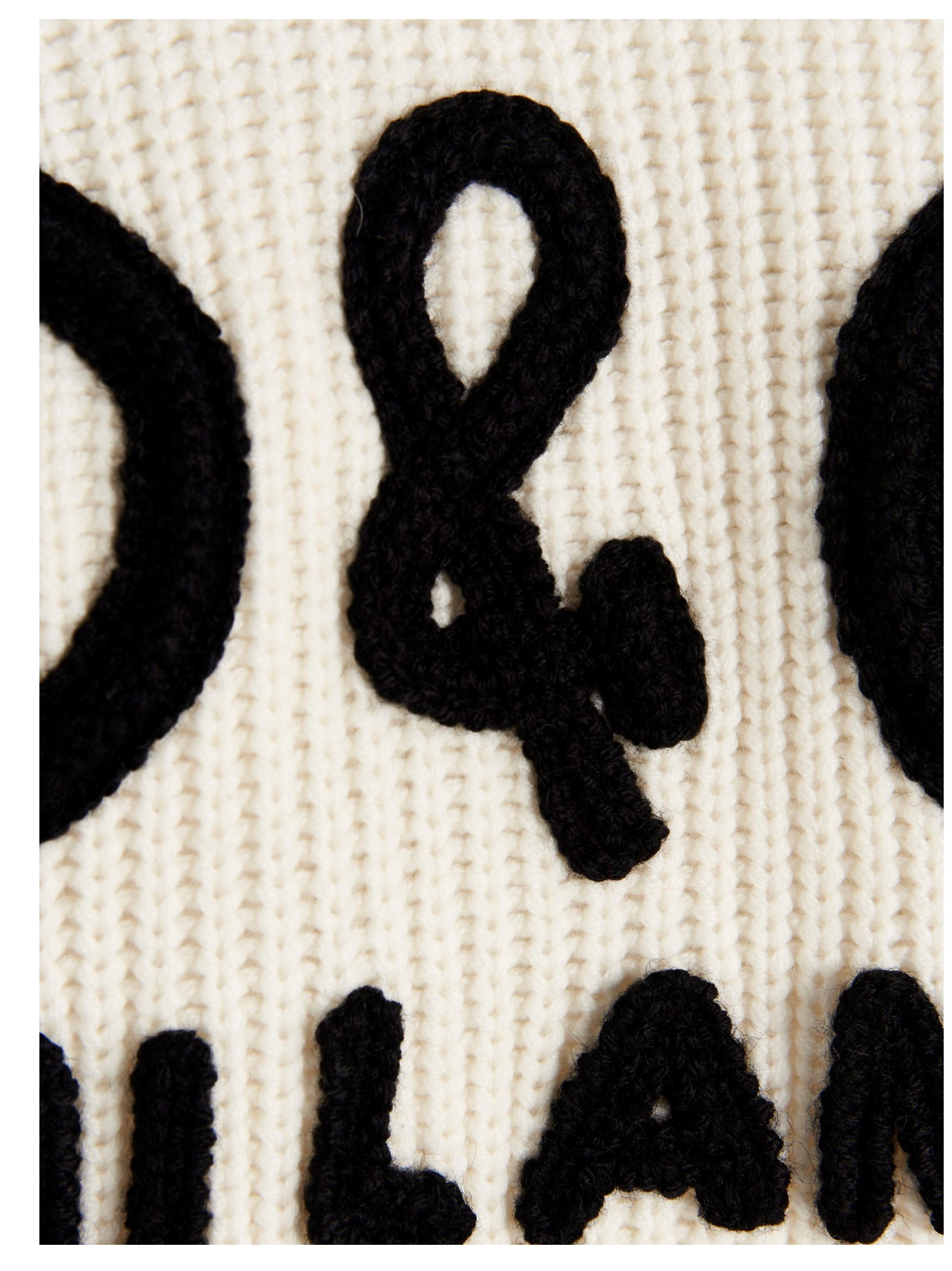 Logo wool, crewneck sweater with all over contrasting logo intarsia.