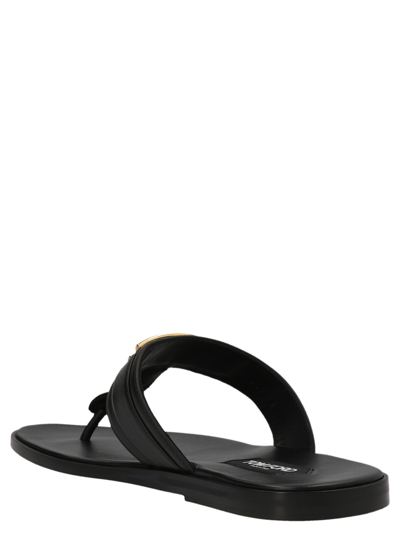 Thong-style leather sandals with front metal logo appliqué and a rubber sole.