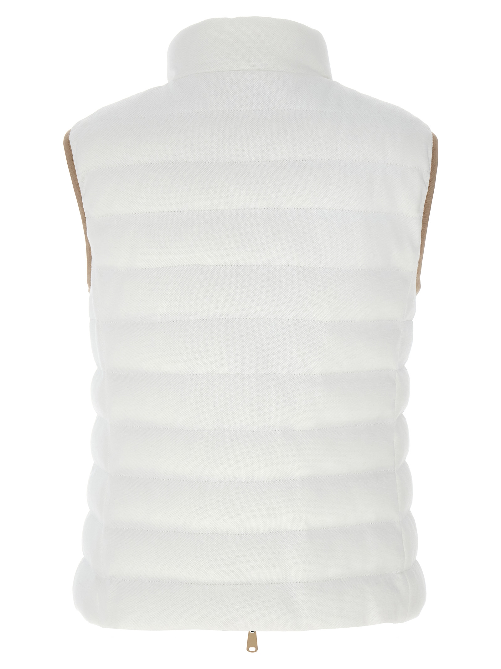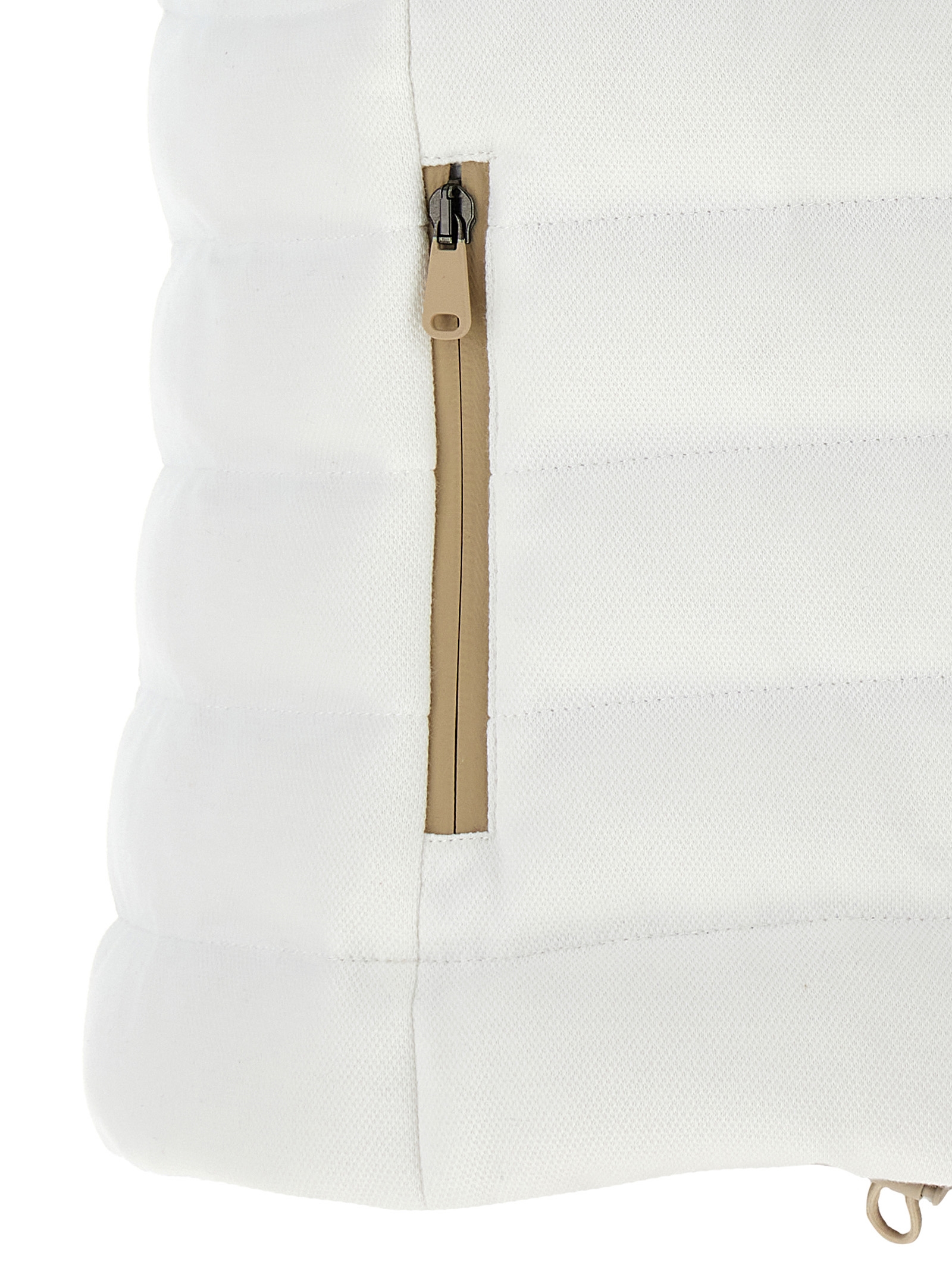 Goose down padded cotton vest with contrast details, front logo patch, pockets, zip closure, high neck.