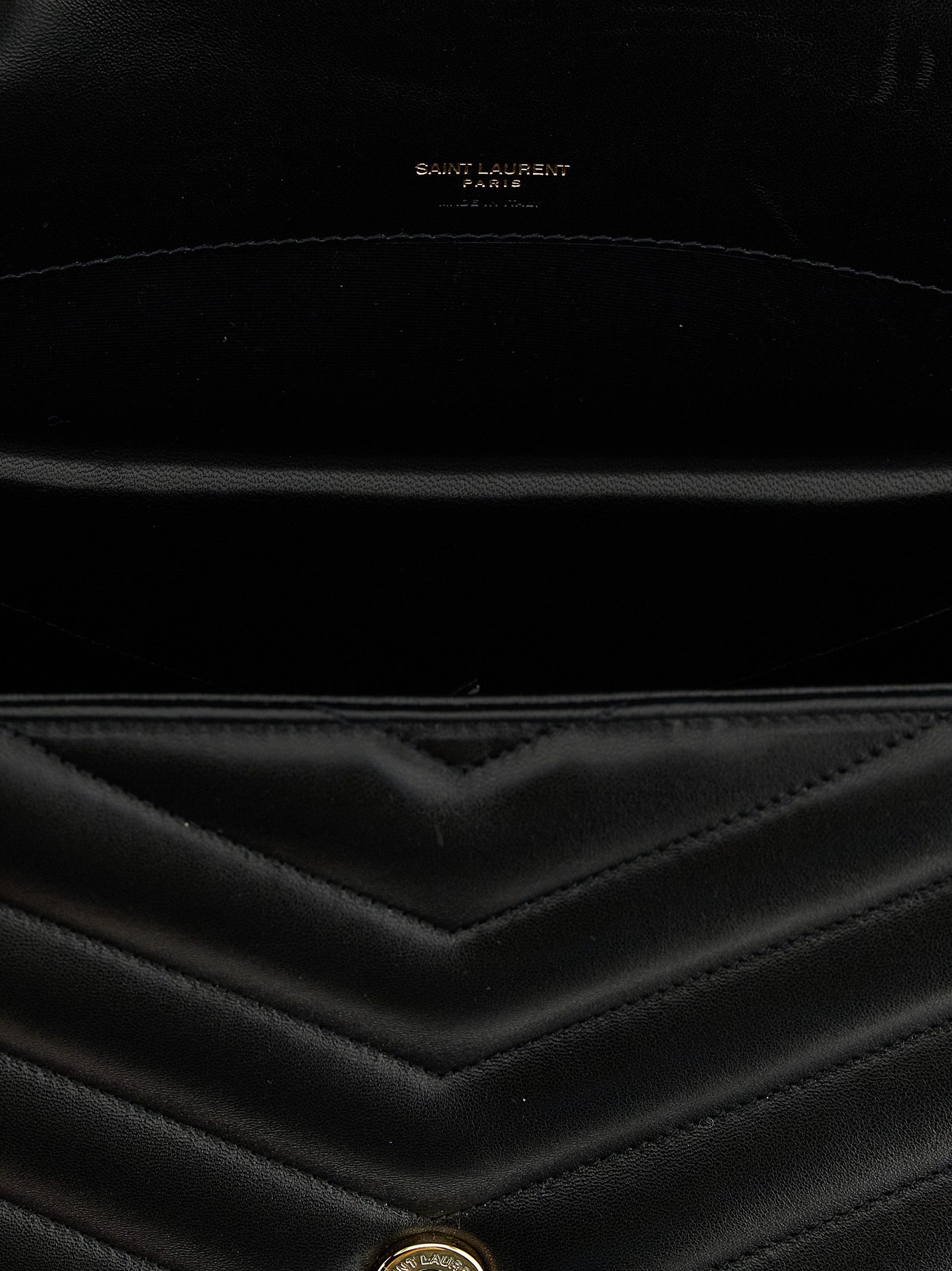 Large ‘Loulou’ lambskin shoulder bag with chevron quilted stitching, magnetic flap closure with antiqued metal Cassandra logo on the front, cotton lining, sliding chain shoulder strap with leather protection, removable clutch bag, mirror.