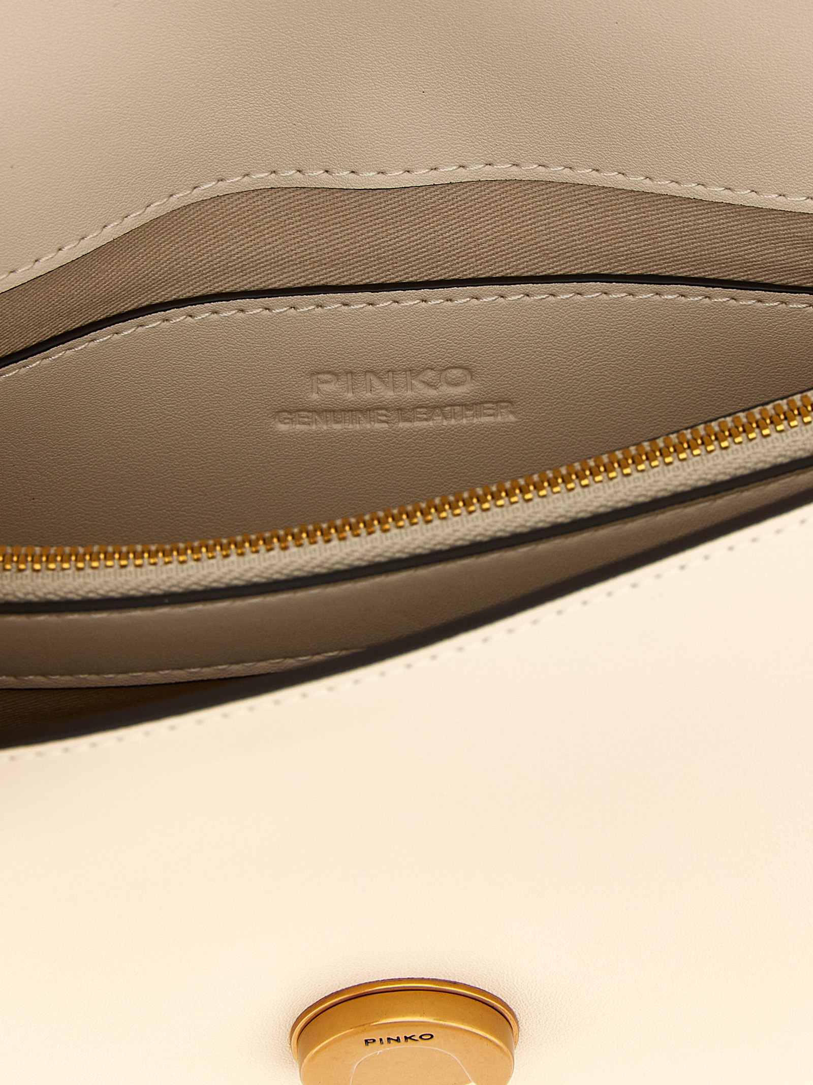 ‘Love One Mini’ leather crossbody bag, interlocking flap closure with front metal logo appliqué, chain shoulder strap with removable leather protection.