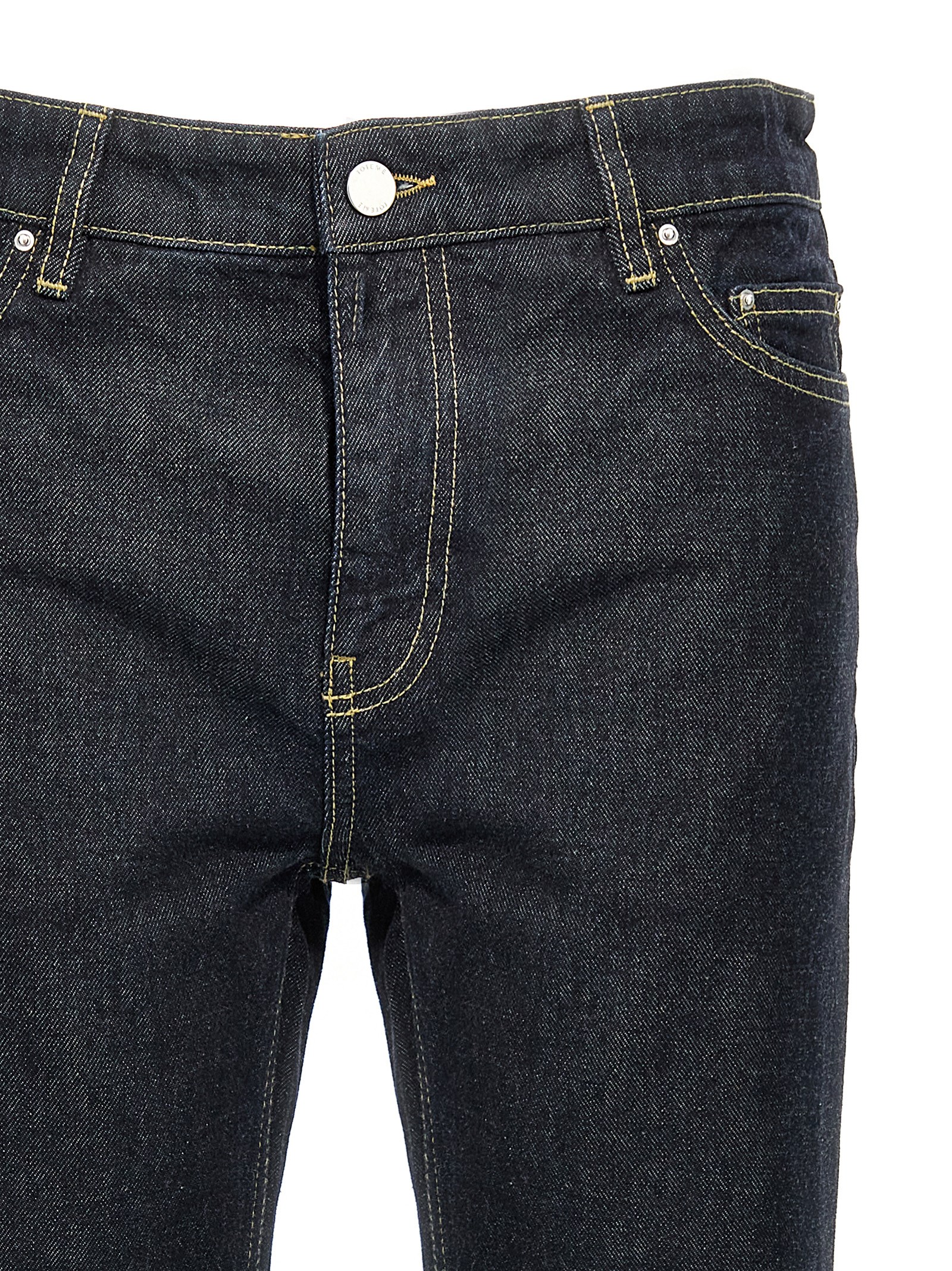 ‘Low Taper’ cotton denim jeans with zip and button closure, five pockets, leather logo tag.
