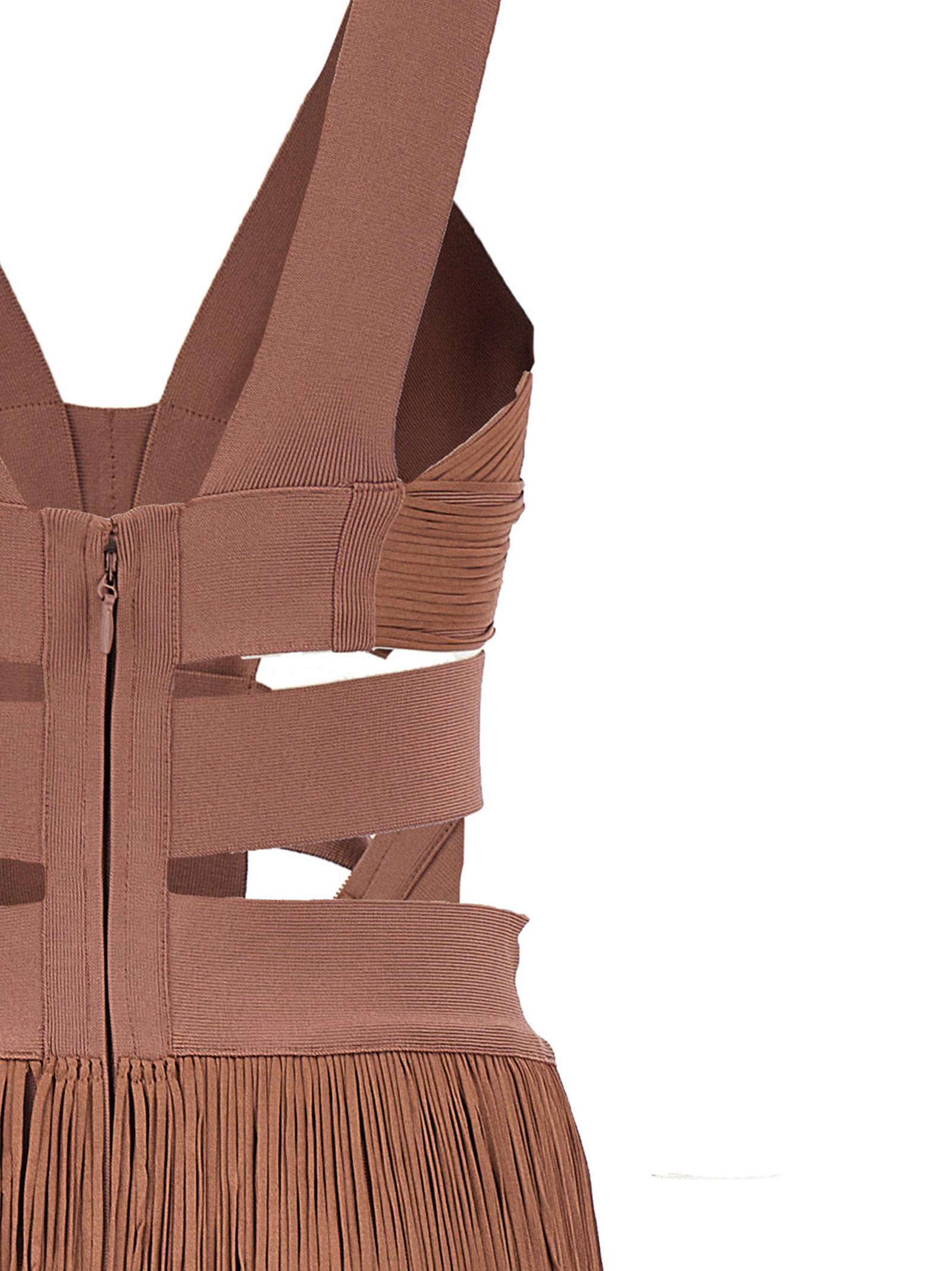 Low Waist Banded Fringe’ knit dress with all-over fringed appliqués, cut-out details, shoulder straps and a back zip closure.