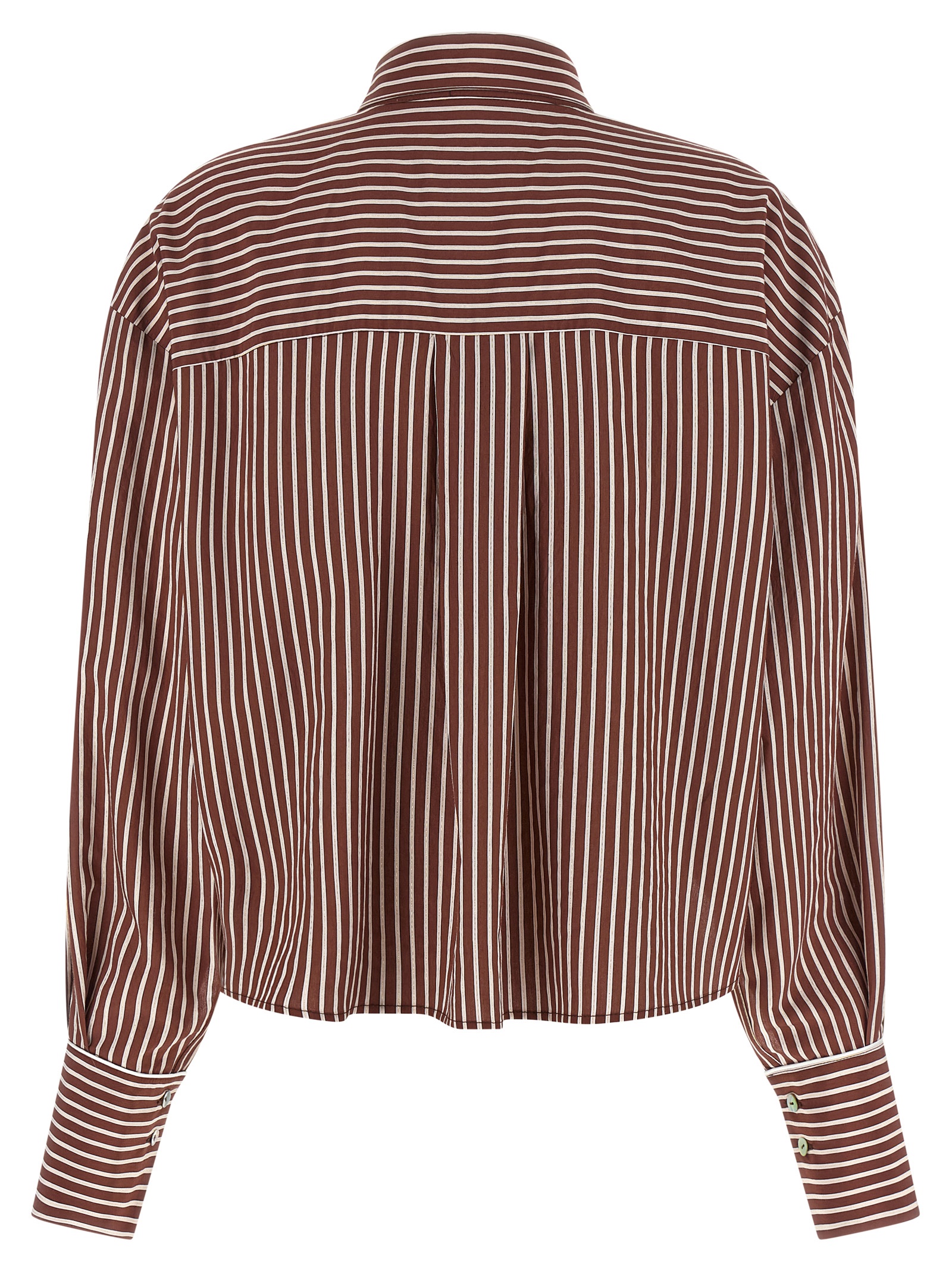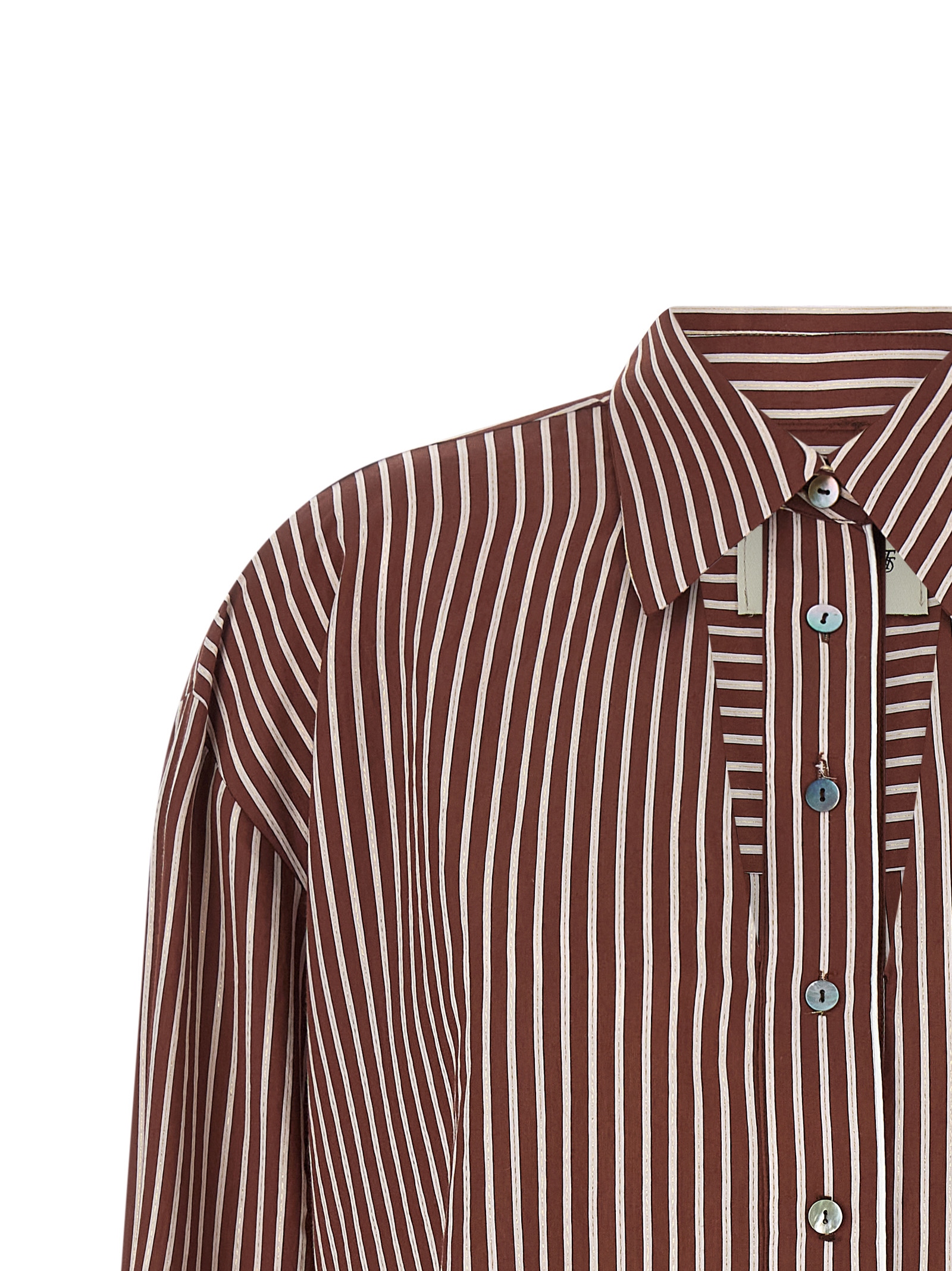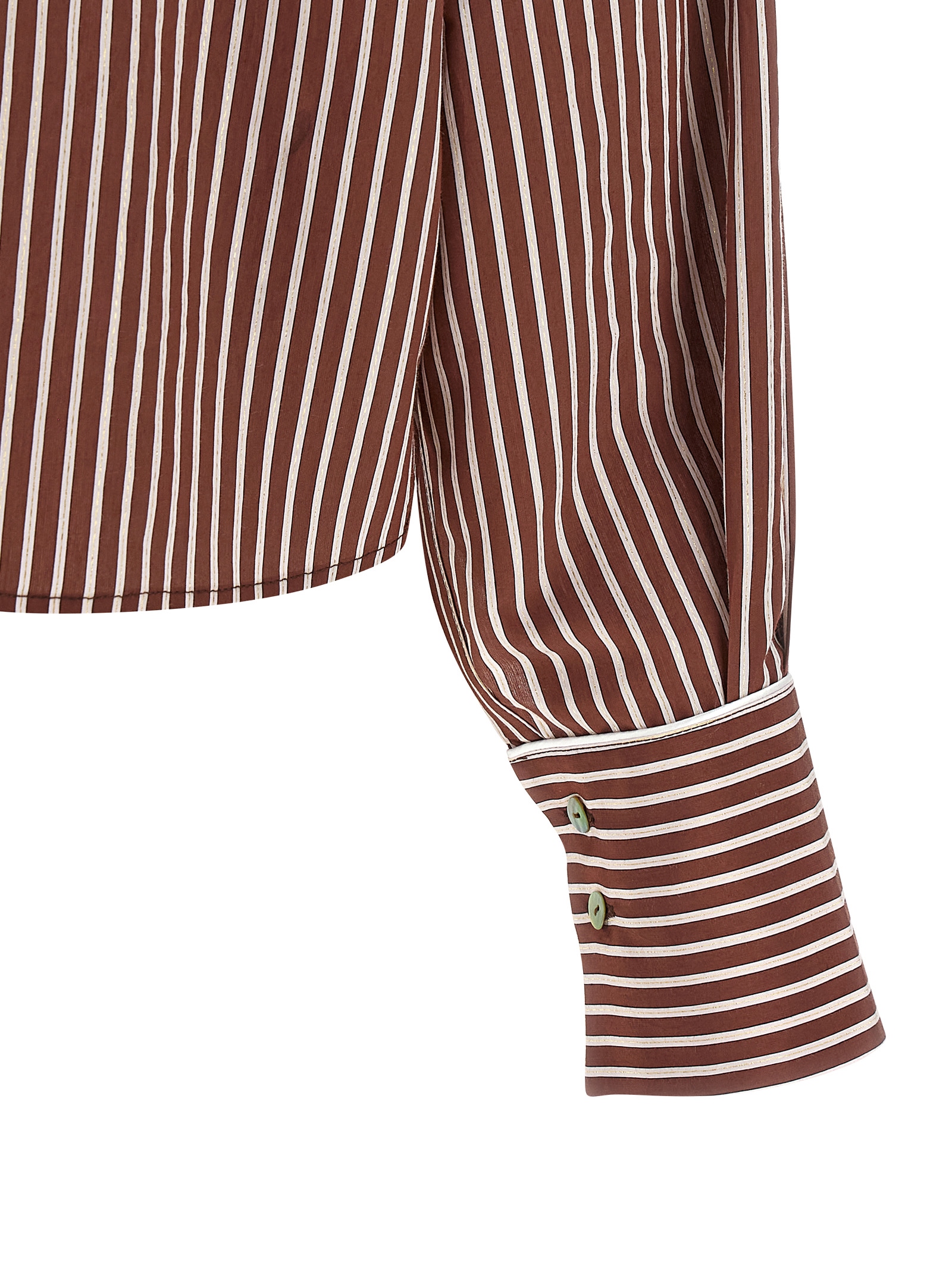 ‘Luna’ striped cotton poplin shirt with lamé thread, slightly cropped style, pointed collar, mother-of-pearl button closure with front cut-out details, long sleeves with cuffs and dropped shoulders, rounded and asymmetrical hem.