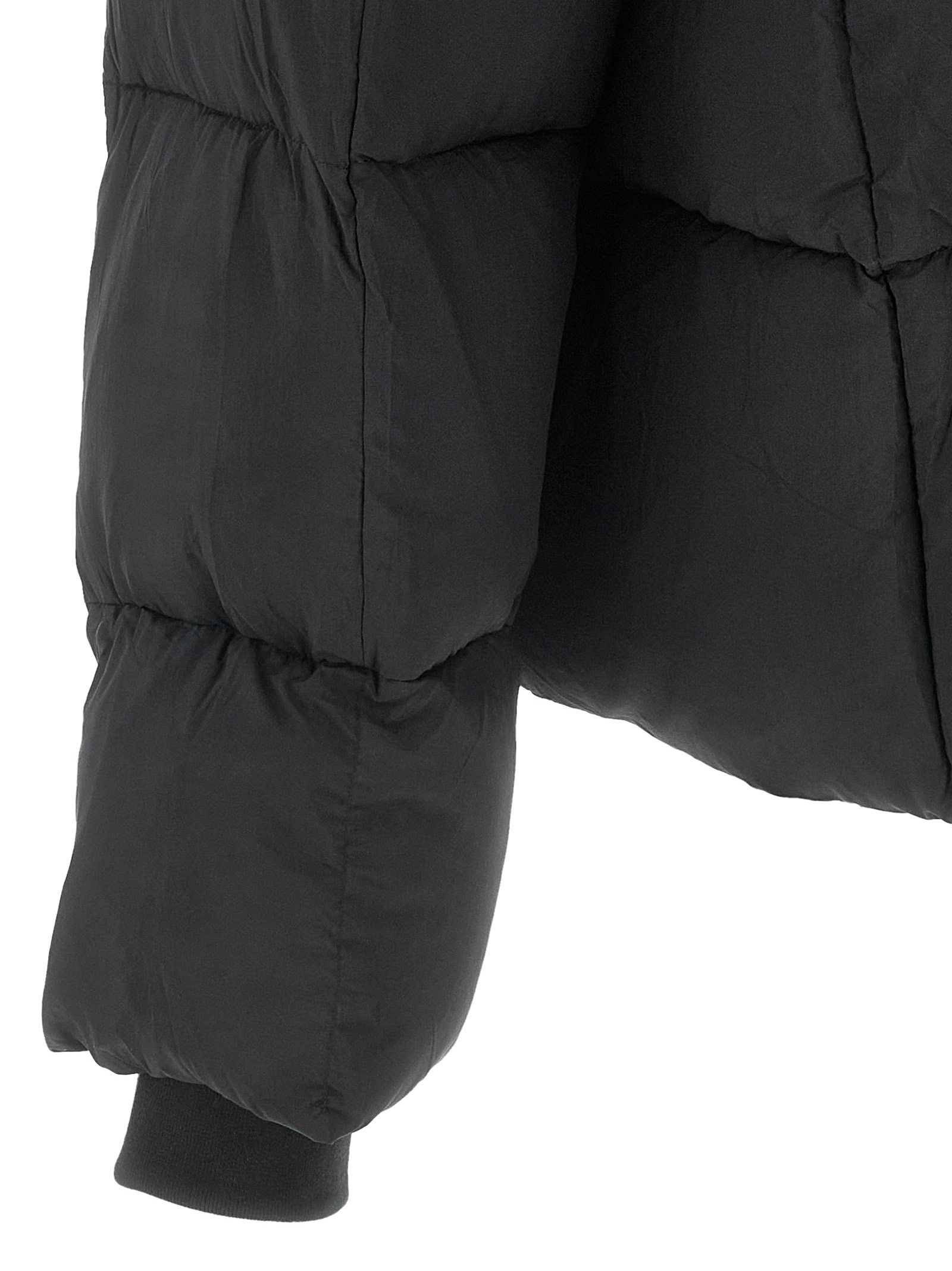 ‘M J 78’ water-repellent and padded quilted nylon down jacket, hood, high neck, front zip closure, pockets, long sleeves with knitted cuffs, drawstring on asymmetrical hem.