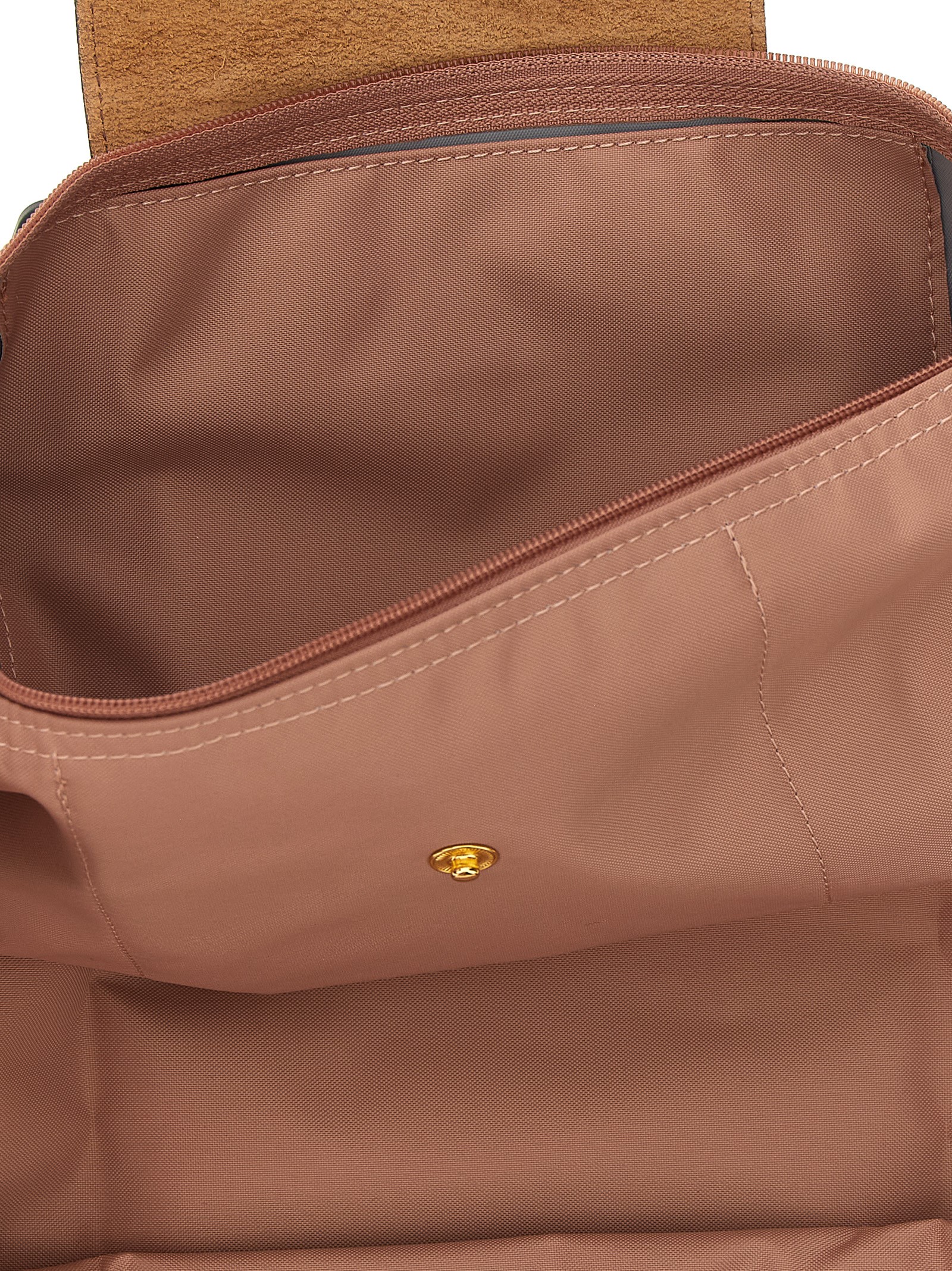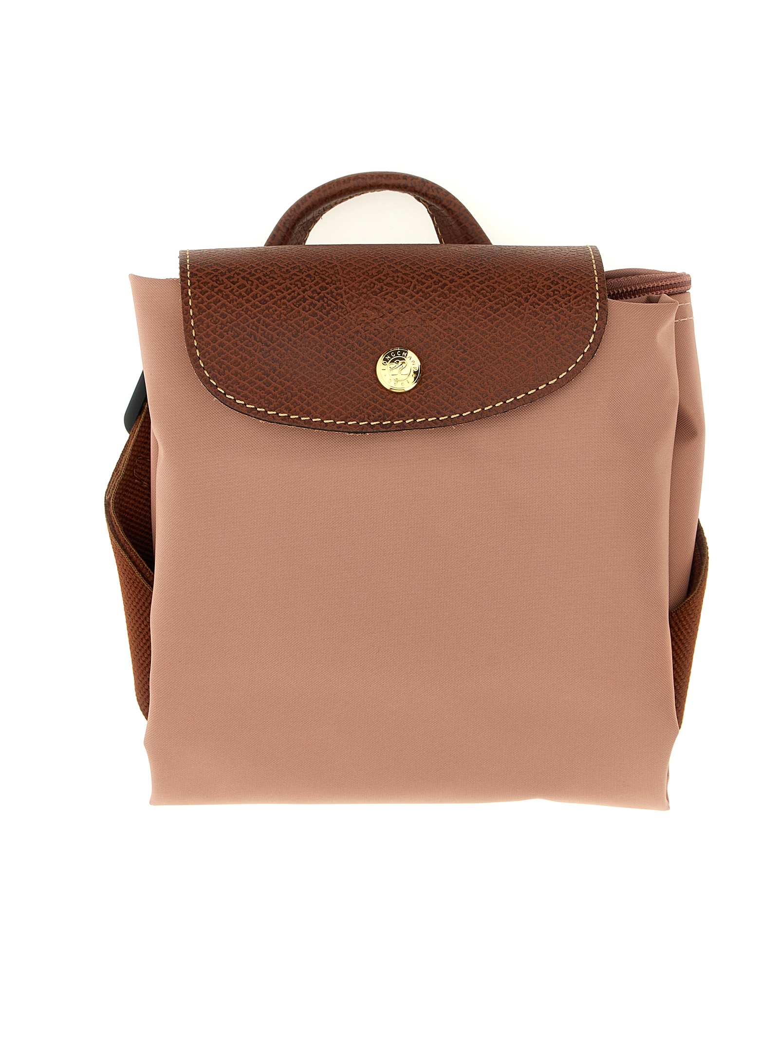‘M Le Pliage Original’ backpack in foldable nylon canvas, top zip closure, fixed leather handle, leather flap with snap button closure and embossed logo, adjustable shoulder straps.