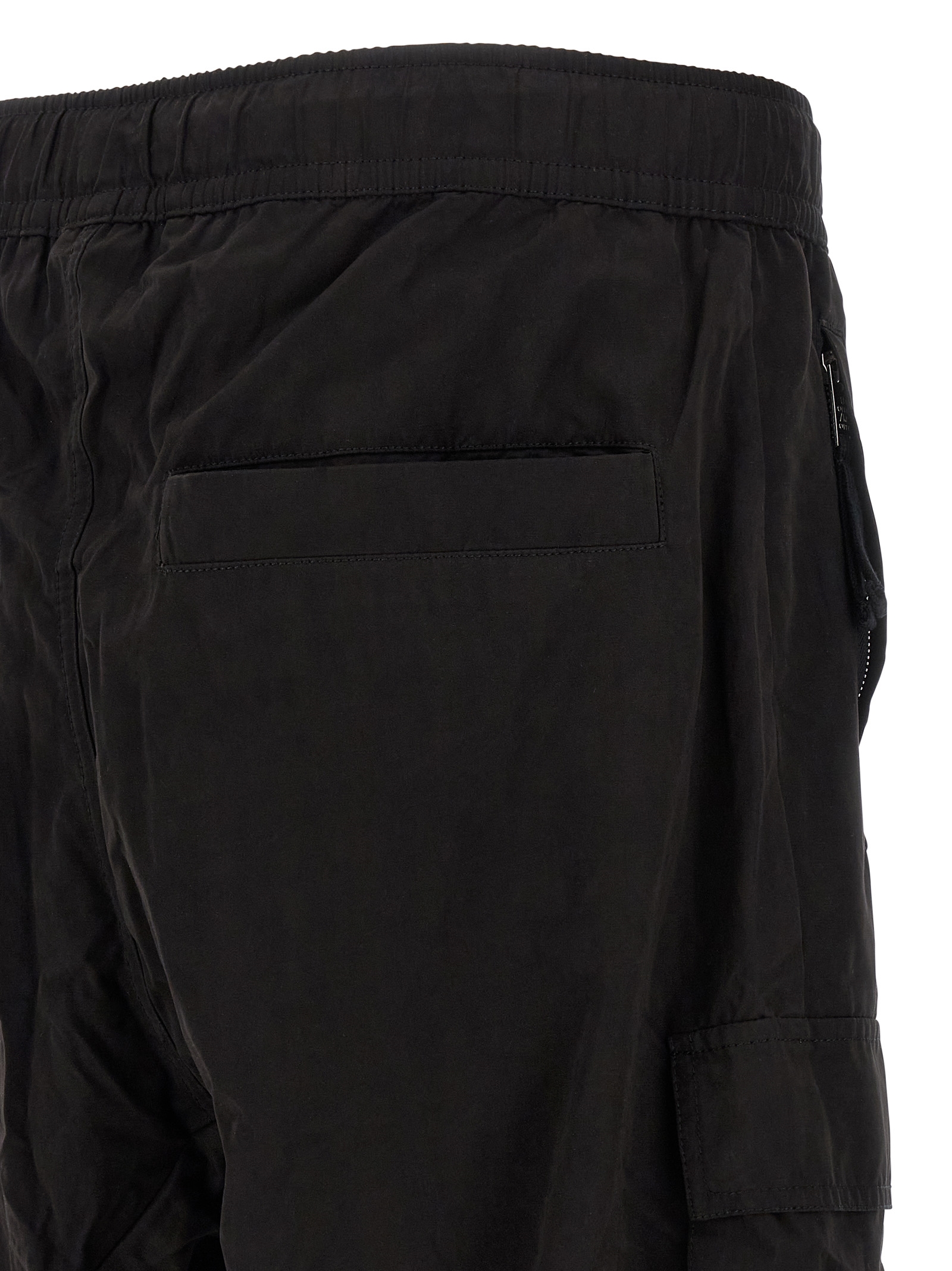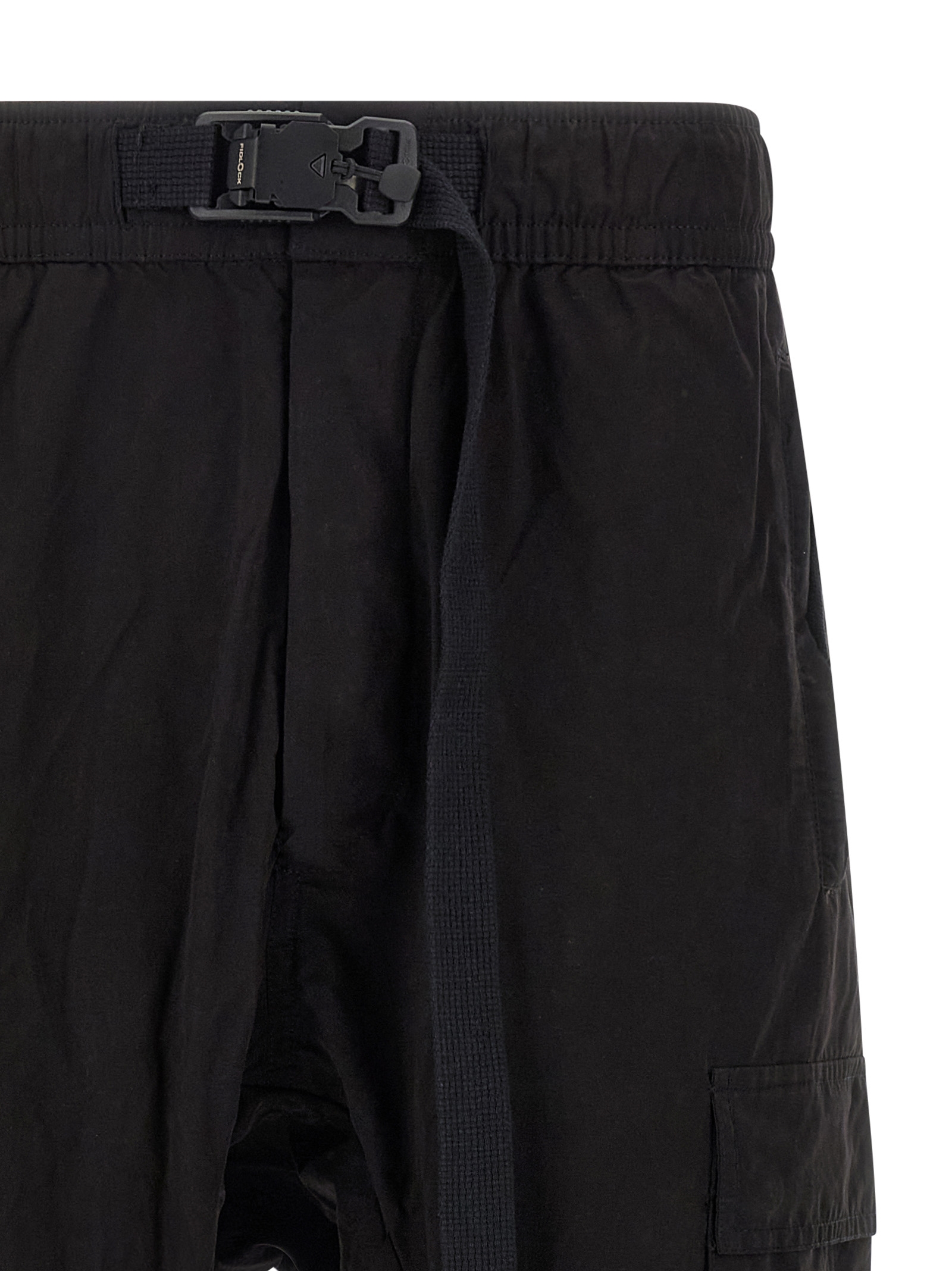 ‘M P 15’ cargo pants in peached cotton blend with side pockets, low crotch, elastic waistband with integrated belt with cinch closure, flap with snap buttons, pockets, wide leg that tightens at the ankle with elastic cuffs.